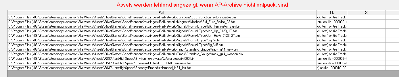 Dies kann ich aber sehr wahrscheinlich auch in einer .bin Datei korrigieren, danach mit Hilfe der RW-Tools (vorher zuerst die Sintrain Assets aus dem Railworksordner verschieben) überprüfen dort sollten dann ja keine Fehlenden Dinge aufgelistet werden. -