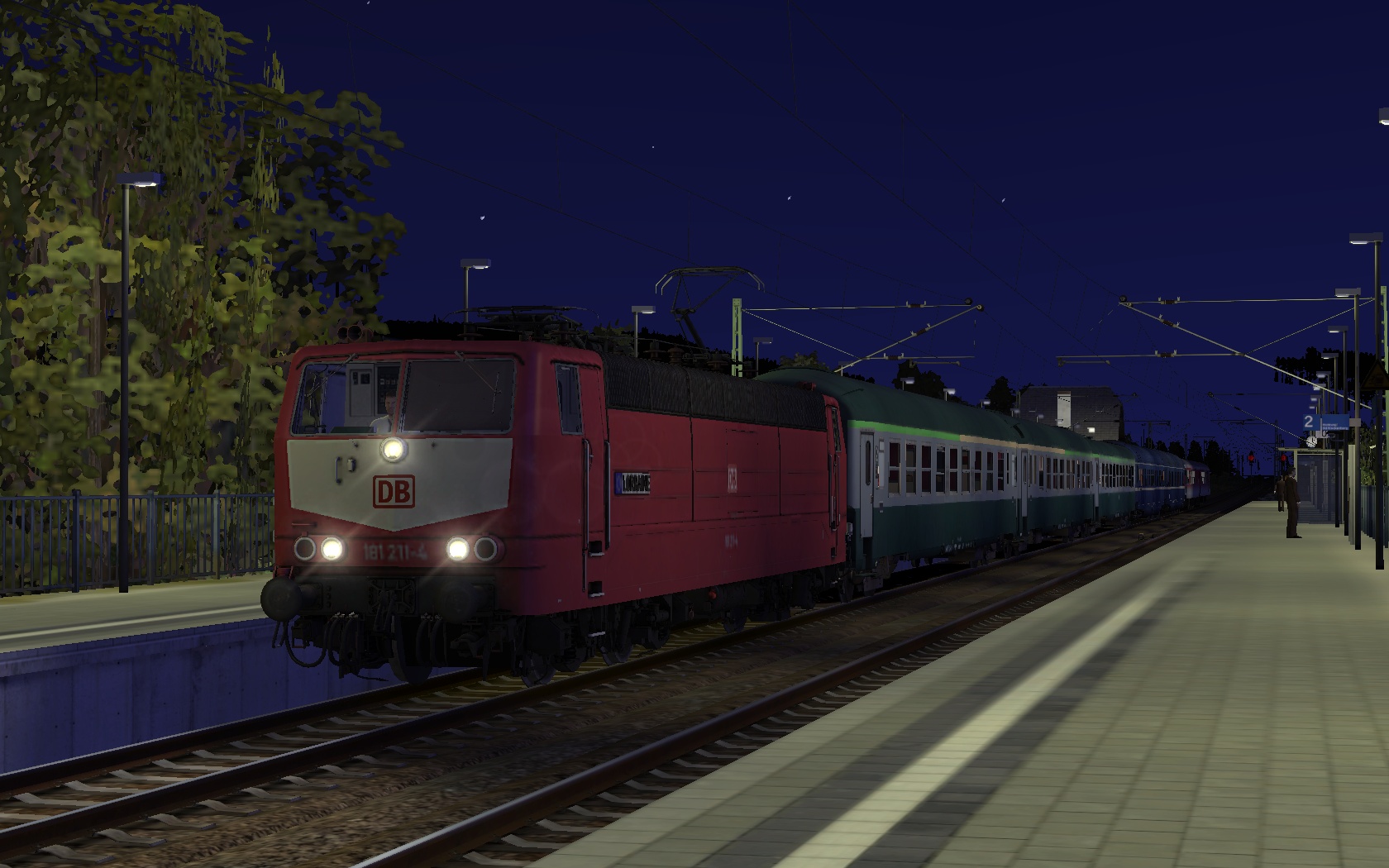 Willkommen an Bord des D 666 Kopenhagen - Oostende/Paris Est bzw. D 1266 Kopenhagen - Wildau. Wir befinden uns im Jahr 2002 und fahren mit dem mittlerweile geflügelten D 666 von Altenburg Hbf bis Hoch Merzburg Süd inkl. Systemwechsel in Hoch Merzburg Hbf. Es ist eine laue Sommernacht an einem Wochenende. Es ist wenig los. Unterwegs begegnen wir nur zwei Zügen der Linie S3 Bad Rinkenburg Hbf - Hoch Merzburg Hbf in Form der BR 423. Gebildet ist unser Zug aus drei UIC-X Liegewagen der SNCF, zwei WLABmh 175 in blau, einem orientroten Bm 235 und einem orientroten BDms 273. Gezogen wird der Zug von der 181 211 "Lorraine" ebenfalls in orientrot.