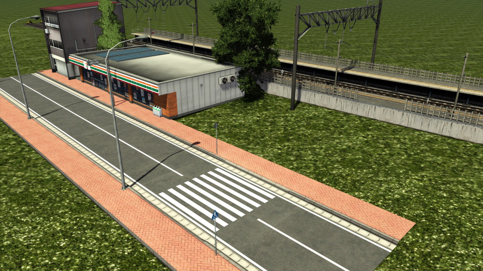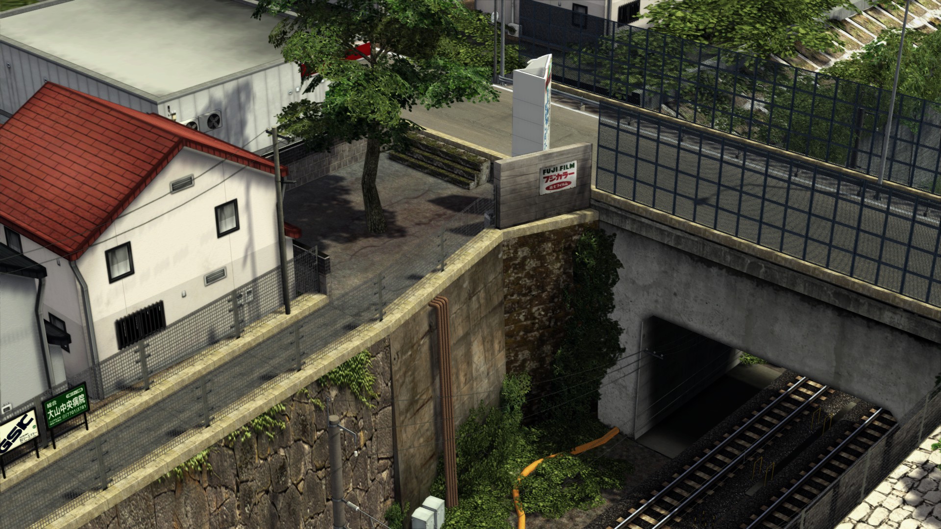 In ungefähr 8 Metern Höhe befindet sich ein kleiner Platz. Ganz prominent in Sichtweite - Werbung. Auch der "Combini" ("Sunkus") darf nicht fehlen. Vom kleinen Platz aus kommt man den sehr steilen Betonweg runter auf Gleishöhe. Es ist ein echtes Abenteuer, solche markanten Orte zu bauen, nur um dieses viel zu grob gerasterte Gelände verstecken zu müssen. Wenn man das ähnlich wie mit der Tunnelfolie einfach "wegmalen" könnte, wäre es viel einfacher.