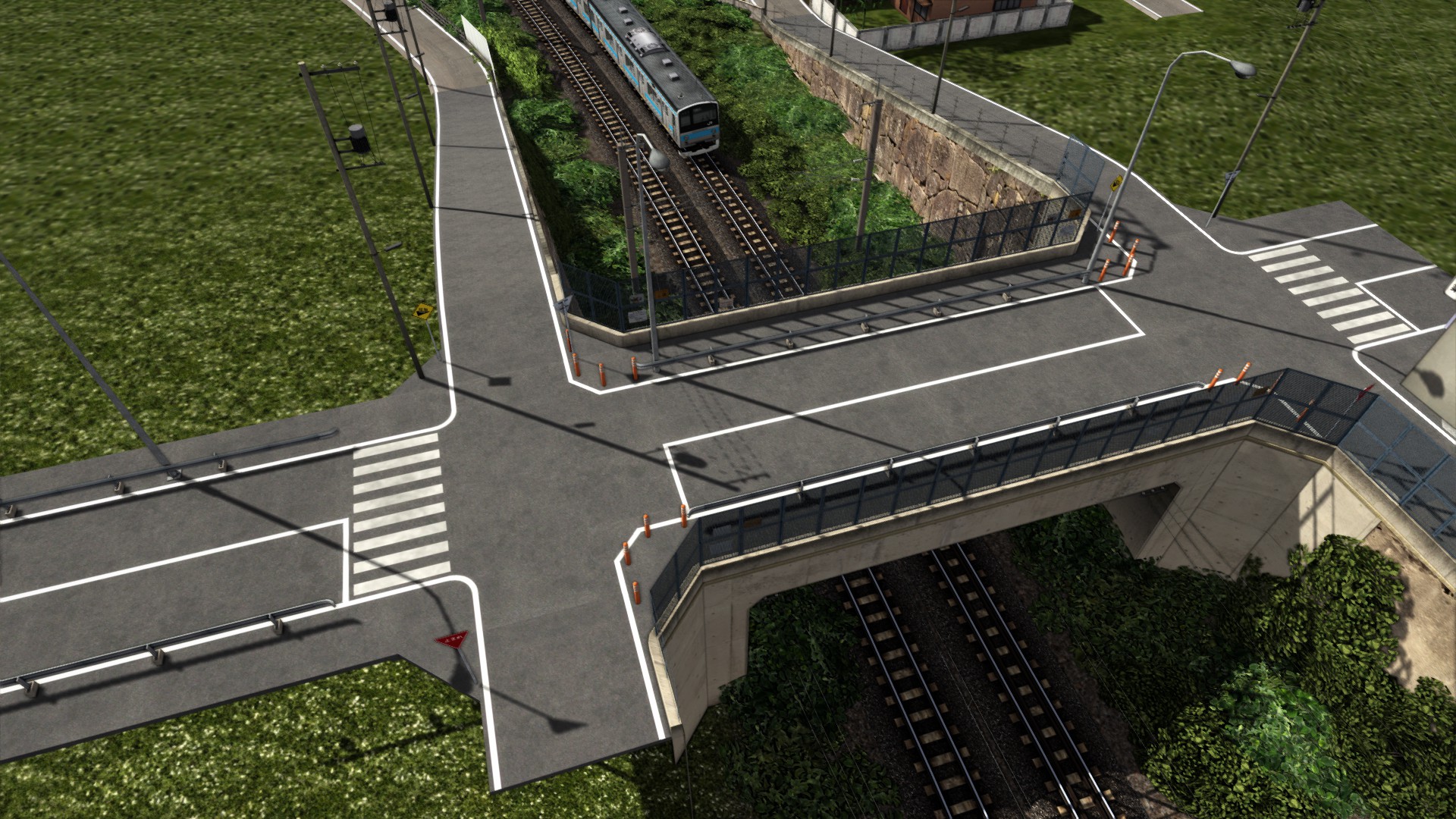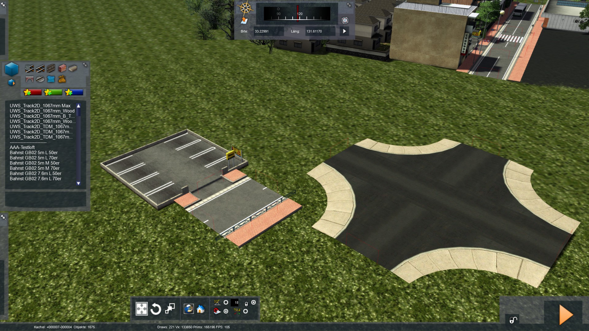 Die Bahnhofsumgebung ist etwas gewachsen - um einen Parkplatz, der sich auch nahtlos an das Straßenloft anfügt. Etwas genauer erklärt. Auf Bild 2 sieht man eine der ...hässlichen... Kreuzungen aus Kuju-Zeiten, die man ebenfalls an ein Straßenloft ansnappen kann. Die roten Linien an den Enden zeigen das an. Mein Parkplatzmodul ist im Grunde nichts anderes, bis auf das ein anderes Modell drauf ist, das zwar auch als Kreuzung definiert ist und darum an das Straßenloft angefügt werden kann, aber optisch ein 10m langes Stück Straße ist, an der ein Parkplatz und allerhand andere Teile angeklebt sind.
