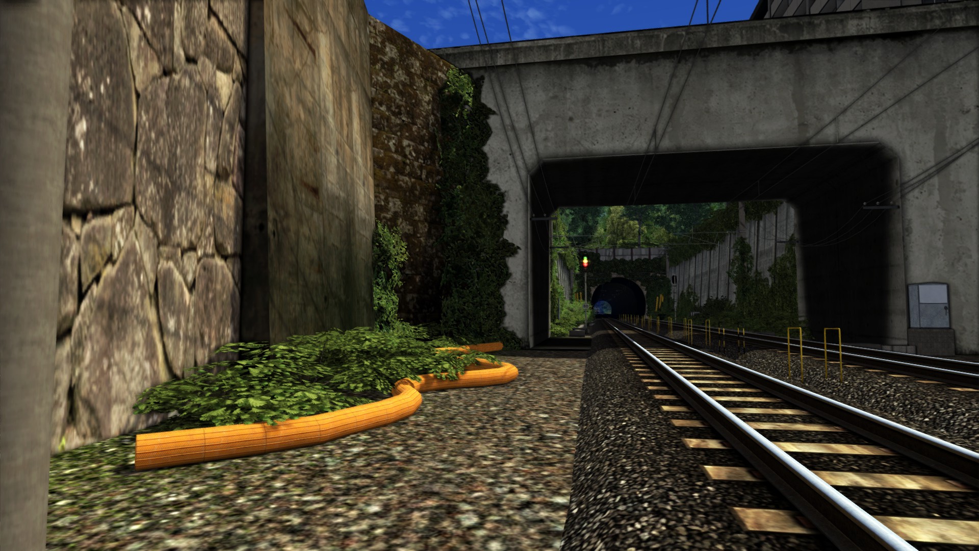 Zur Zeit sitze ich an einem Tunnel. Weil die Tunnelröhre als Loft-Objekt nie so wirklich am Portal gepasst hat und ständig die Sonne durch irgendwelche Ritzen reinschien, ist der Tunnel nun am Stück. Inklusive der weitläufigen Betonwände vor der Einfahrt. Er wächst also noch. Was einzeln gesetzt wurde, ist das ganze Drumherum. Vor allem die wuchernden Pflanzen.