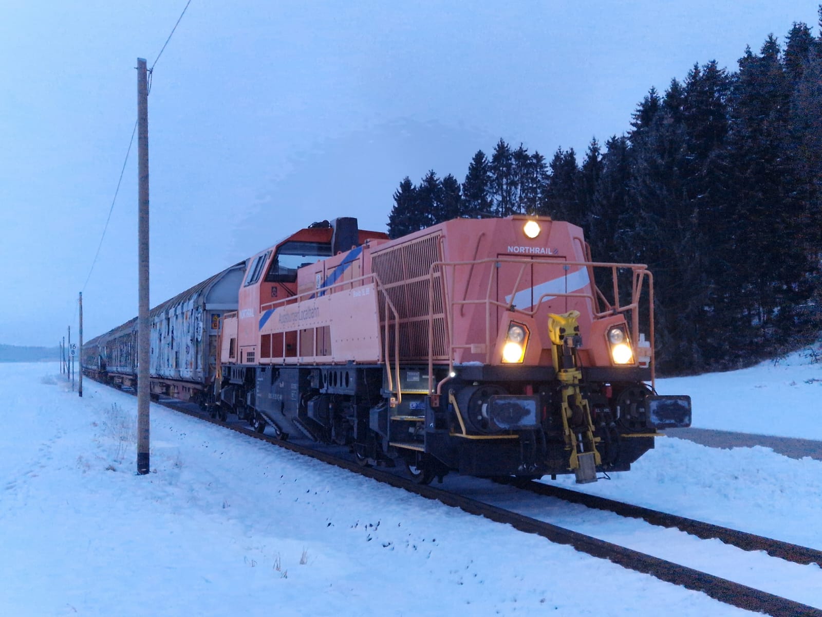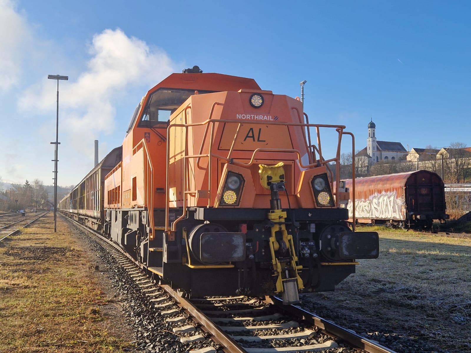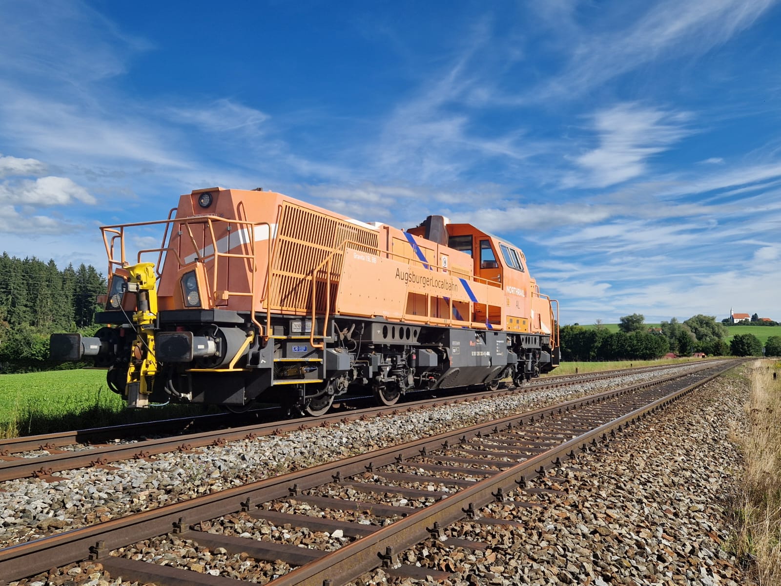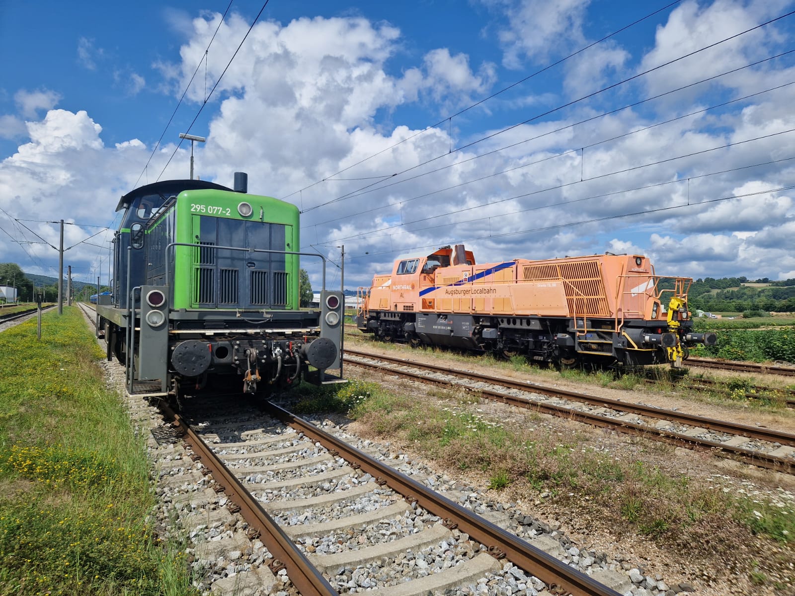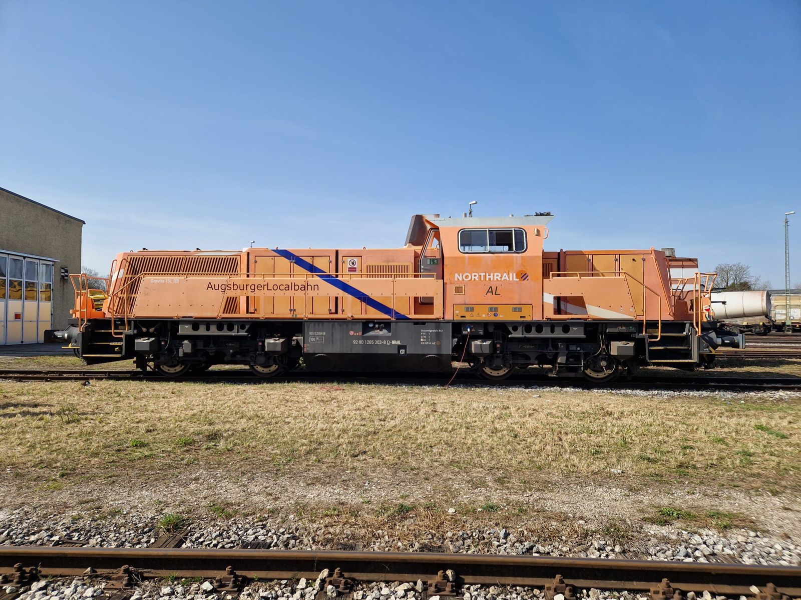 Anbei drei Fotos der Lok:Wie man sieht hat die Lok das normale Northrail-Design zusätzlich mit einem Schriftzug "Augsburger Localbahn" sowie "AL"-Logos am Führerhaus und am hinteren Vorbau, jedoch ohne üblichen Rahmen. Am Montag wird die Lok vsl wieder am "Schongauer" sein.