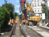 # Baurbeiten mit Erdbohrer und entfernten Gleisen in der Breite eines BÜ. Wird also ein BÜ gebaut, oder wurde einer entfernt (passt eigentlich rechts nicht)? Der Erdbohrer lässt auch