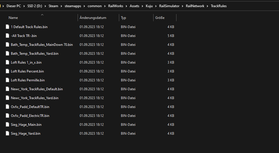 Also, die CS_Addon Assets fehlen wirklich, das Kuju KS auch (nicht im Kuju Ordner aber in Diversen anderen z.B. IKB o. Konstanz Villingen), die New York Trackrules haben bei mir nicht den 2ten Unterordner (...\Assets\Kuju\RailSimulator\RailNetwork\TrackRules\Newc_York_TrackRules_Default.bin), die RSDL Sachen sind in einer .ap Datei, die IKB Sachen sind bei mir unter SAD2016 und die noch fehlenden Schienenbus Assets sind auch nicht vorhanden