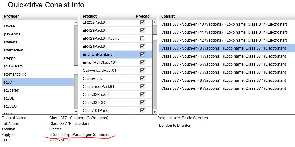im Prelaod Ordner von London-Brighton (Assets\RSC\BrightonMainLine\PreLoad) gibt es fahrbare Consists, z.B. Cl377_Southern_6.xml