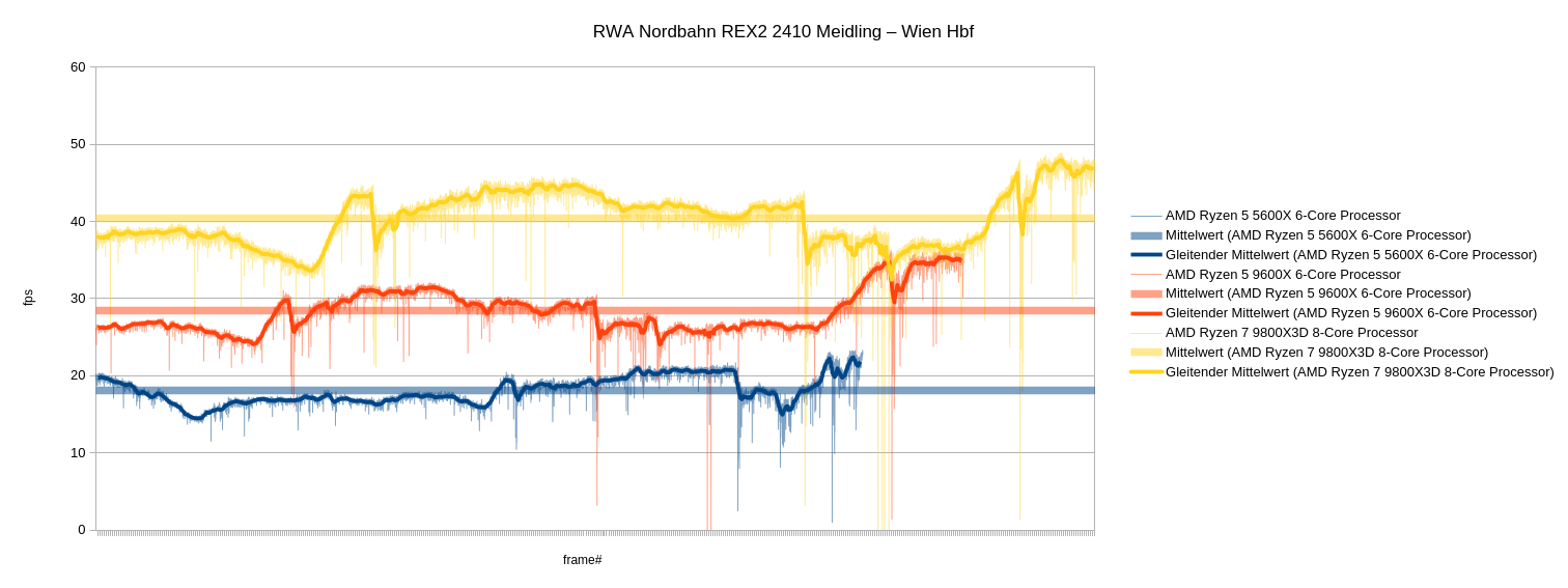 Bei dieser Testfahrt ist in Wien Westbf. ein seltsames Phänomen aufgetreten: Hier brach die Framerate mit allen CPUs auf 25 fps ein. Nach dem Verlassen des Bahnsteigbereichs wurde dies dann deutlich besser und die beiden Zen5-CPUs bewegten sich dann häufig im GPU-Limit bei über 60 fps. Im normalen Spiel hätte hier bereits die Frameratenbegrenzung gegriffen.