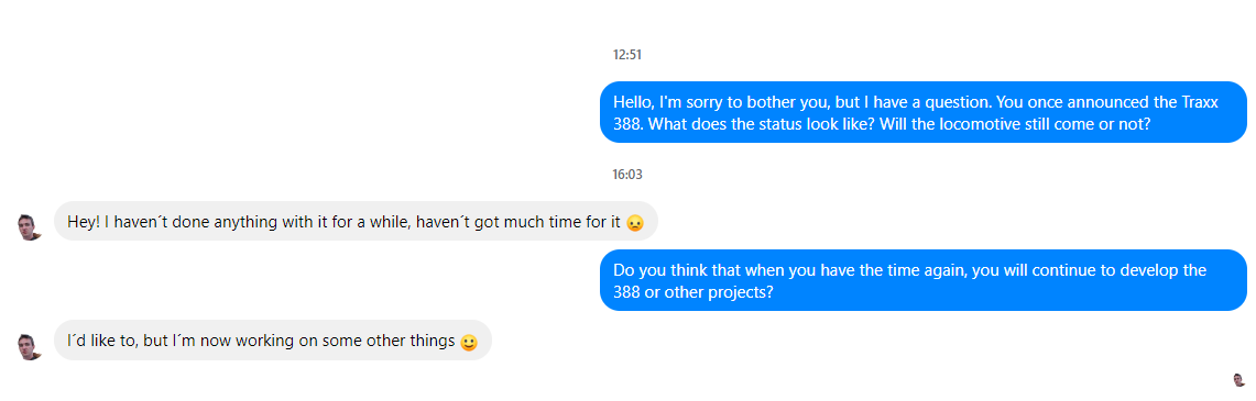 Hallo Leute .Was auch noch cool wäre für TS wäre das Addon https://virtual-railroads.de/d…111-dosto-expertline.html in einem Redesign Repaint . Sprich mit orangener ZZA ,neuen Sitzen ,neue Lackierung, und neue Piktogramme und neue Türschließsignale. Und alles drum und dran neu im Führerstand des