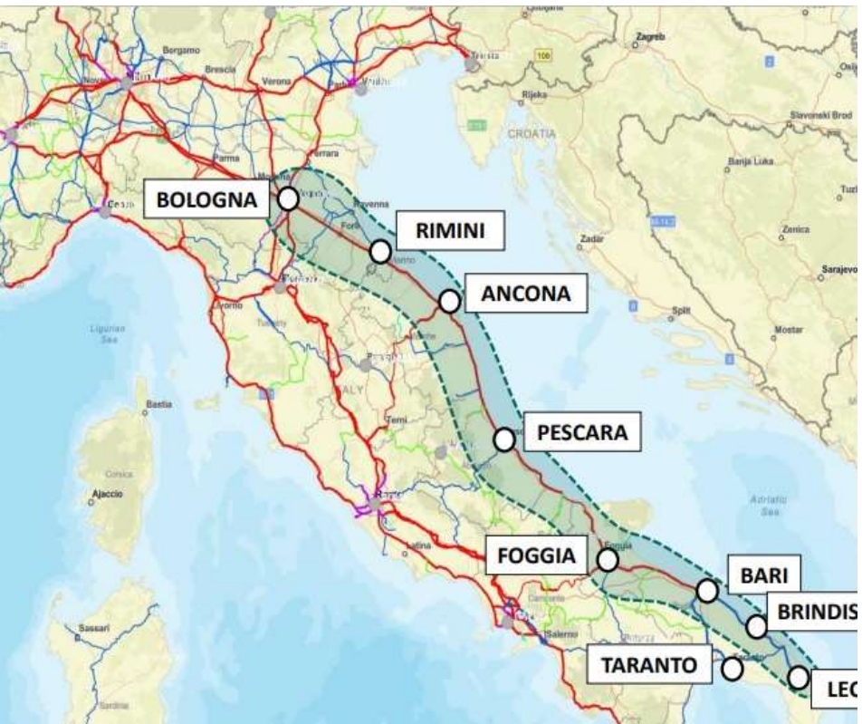 Letzterer beginnt in Bologna und endet in Lecce und durchquert fünf Regionen: Emilia-Romagna, Marken, Abruzzen, Molise und Apulien. Von Rimini aus verläuft sie entlang der schmalen Küste zwischen den Hügeln, der Autobahn, der Staatsstraße und dem Meer, außer in der Nähe von Ancona, wo sie das Vorgebirge des Conero umrundet. Entlang dieser Route gibt es folgende Abzweigungen: