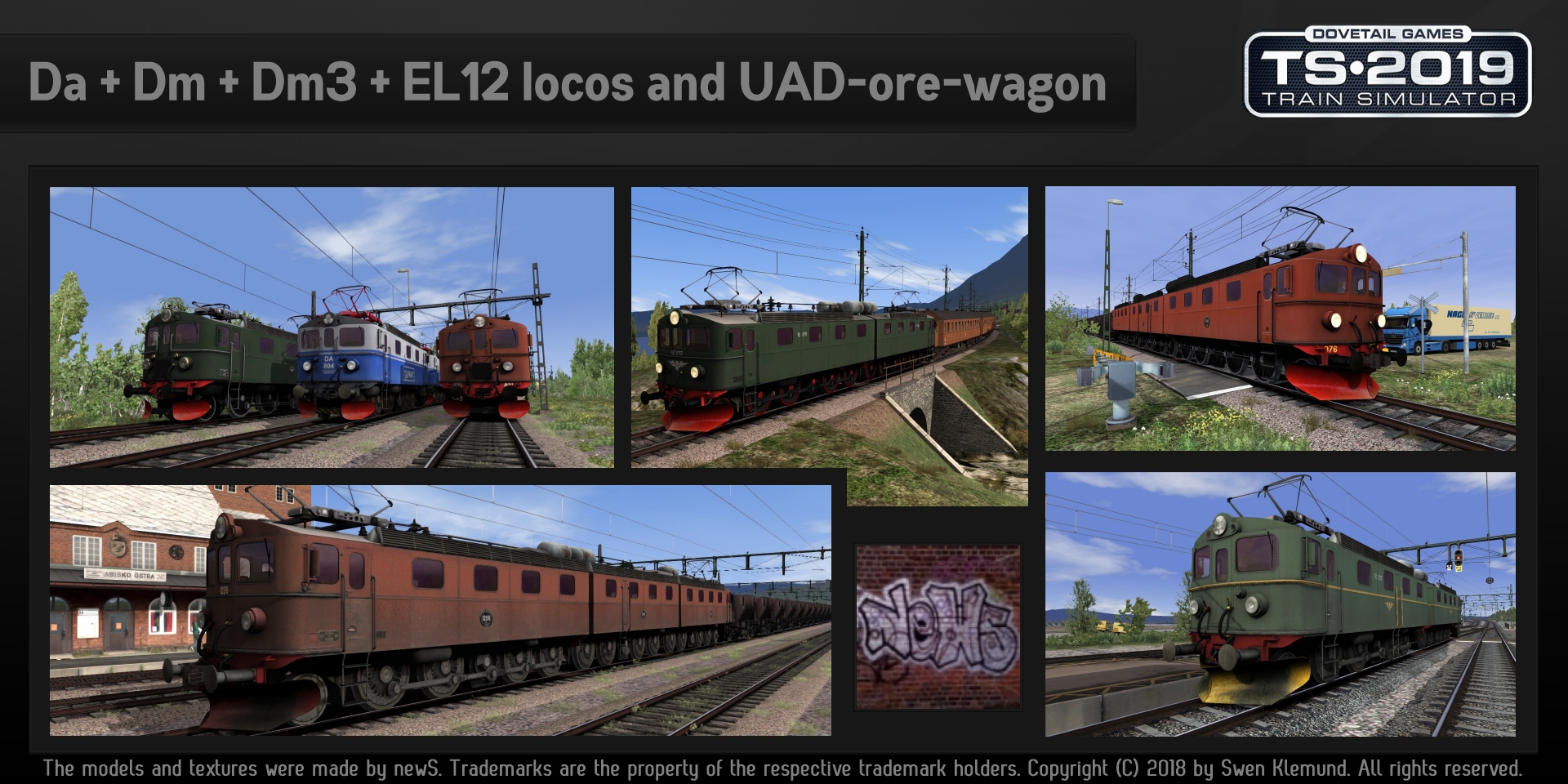 Alles anzeigen18. October 2018 *************************************************** Da, Dm, Dm3, EL12 locos and UAD iron ore wagon v 1.3 for Railworks-Train Simulator 2018 (Dovetail Games) *************************************************** Donationware If you like it, please send me a Donation (minimum 1,-Eur) - Paypal: to swen@klemund.de ------------------------------------------------ Credits: - Da, Dm, Dm3, EL12 - models and textures by newS - Swen Klemund - UAD iron ore wagon made by KMW - Anders Eriksson - some sounds by Mawkish & Marcus Gustafsson - many thanks to Mazz from the swedish forum http://www.e-buzz.se/ for the photos :) ------------------------------------------------ Installation: ------------- Run the utilities.exe and use the Package Manager x:\ ... \Steam\steamapps\common\railworks\utilities.exe terms of use: ------------- - Die in diesem Paket enthaltenen Modelle, Skins und sonstigen Dateien dürfen kostenlos für Privatpersonen zum Spielen im Spiel "Train Simulator 2013+" benutzt werden. - Es ist strikt untersagt das Paket oder Teile davon komerziell zu vertreiben! - Es dürfen KEINE neuen Skins erstellt und zum Download angeboten werden (oder mich vorher fragen swen@klemund.de) - die rwp-Datei darf in Content-Sammlungen zu bestimmten Strecken zum Download angeboten werden, wenn diese Modelle in der jeweiligen Strecke verbaut sind. - Es handelt sich hierbei um Modelle zur ausschliesslich privaten Nutzung. - Ausgewiesene Warenzeichen und Markennamen gehören Ihren jeweiligen Eigentümern. Wer mit diesen Nutzungsbedingungen nicht einverstanden ist, darf dieses Paket nicht nutzen!!! - The models, skins and other files in this package can be used in "Train Simulator 2013+" by private persons. - It's forbidden to use this or parts of the package for commercial use. - It's forbidden to make skins and place them for download (or please first a question to me swen@klemund.de) - if you make a route with this models, you can add this rwp-file to the download-archiv of your route - Trademarks are the property of the respective trademark holders. Accepting one or more parts of the terms of use means usage of this package isnt allowed. ------------------------------------------------ On all questions address swen@klemund.de or swen@klemund.com More rolling stock and objects - go to: http://www.klemund.de/RailSimulator ------------------------------------------------ Inhalt (Included): - Da, Dm and El12 locos - Dm3 1205/1235/1206 brown - Dm3 1217/1238/1218 brown - Dm3 1225/1242/1226 brown - MTAB - UAD iron ore wagon names in the editors list (consist): - -Dm3-1205/1235/1206 brown - -Dm3-1217/1238/1218 brown - -Dm3-1225/1242/1226 brown - -MTAB - UAD ore wagon 6x names in the editors list (locomotions): - Dm3-xxxx brown names in the editors list (wagons): - MTAB Uad First you must select the addons in the editor: - KMW - sweden ------------------------------------------------ Copyright (C) 2018 by Swen Klemund. All rights reserved. -