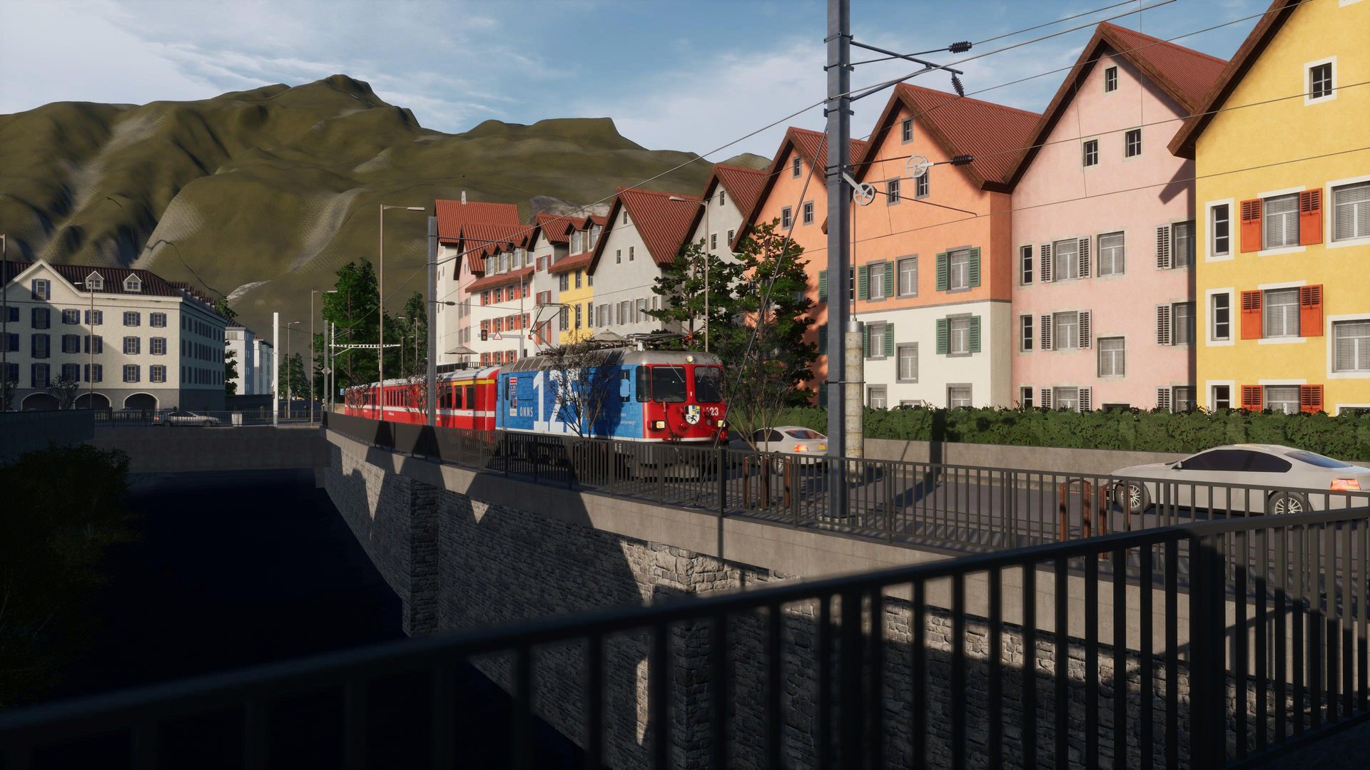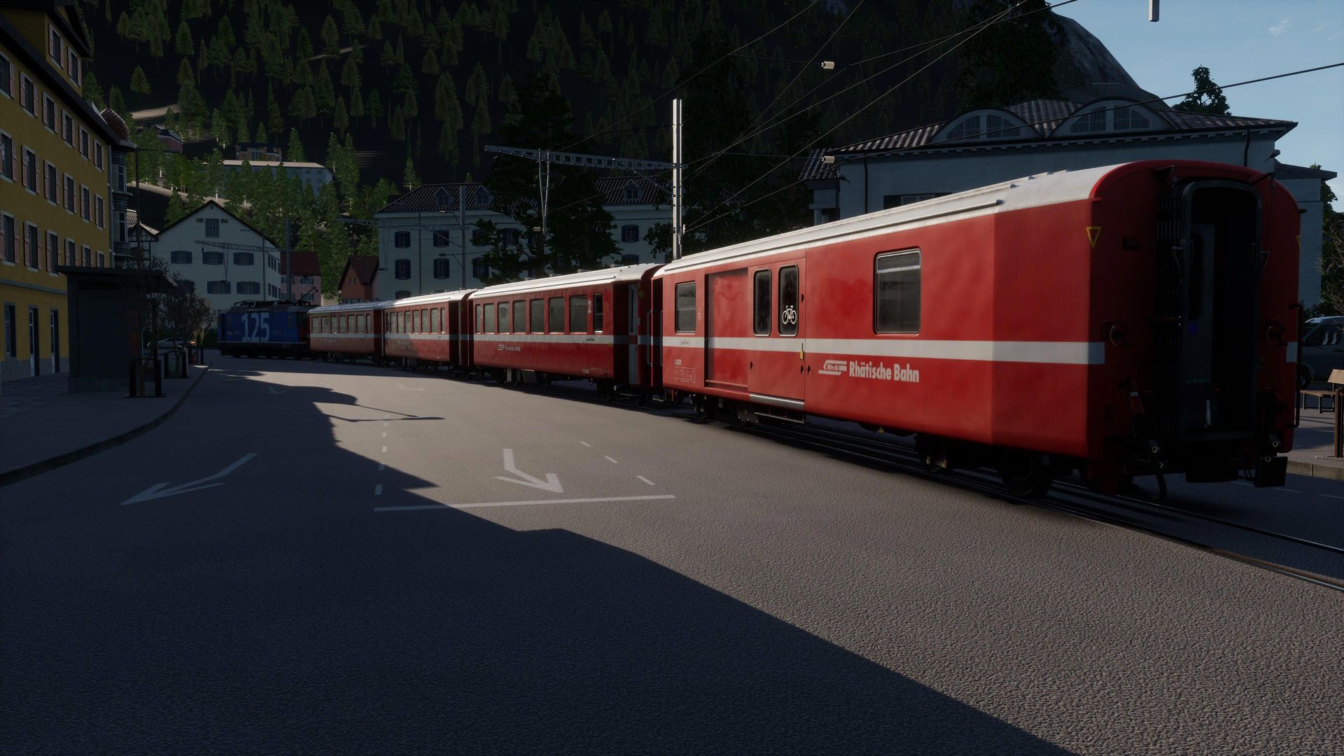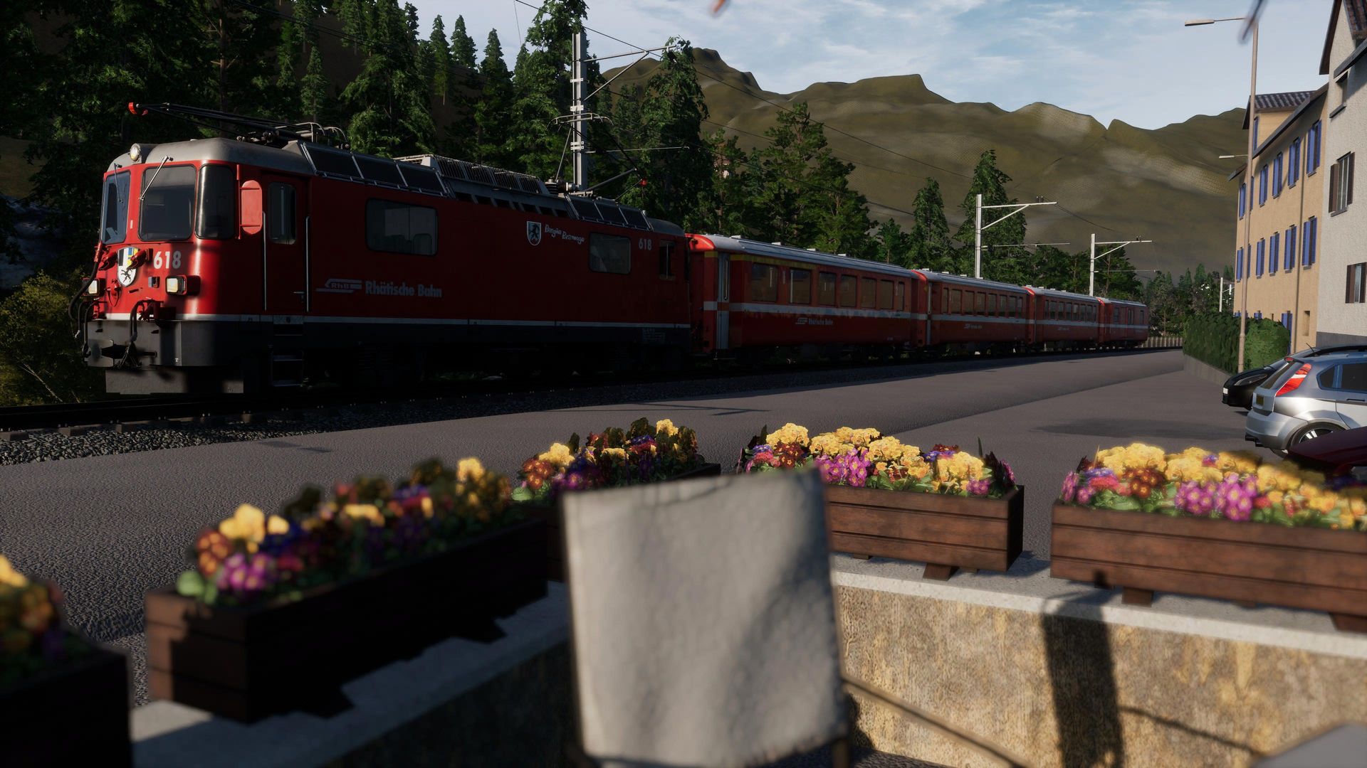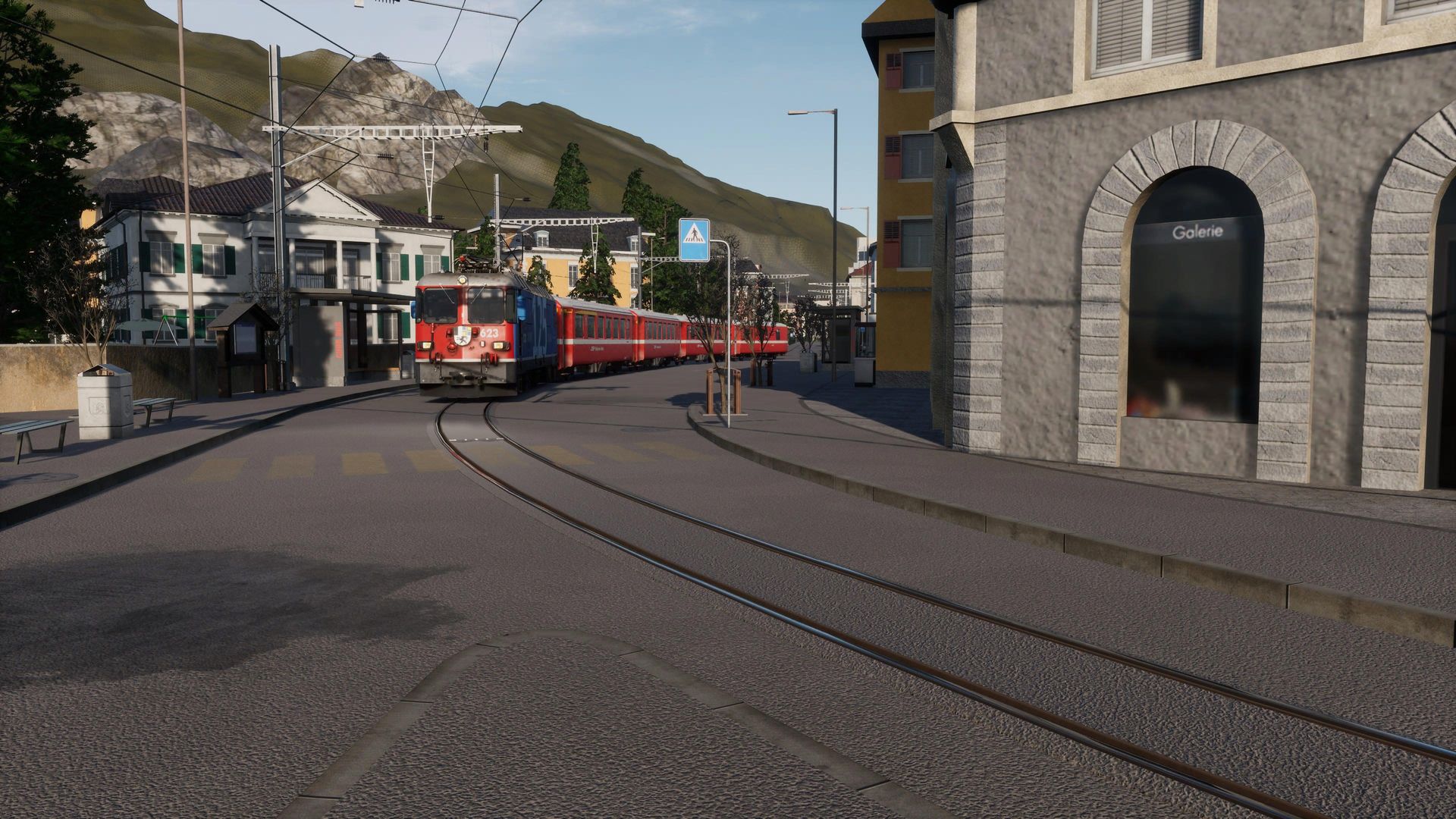 Der Rest hingegen genießt hier fast schon klischeehaftes, schweizer Alpenflair und Gebirgsbahn pur. Auf Straßenbahngleisen schlängeln wir uns vom Bahnhof aus erst einmal mitten durch die Stadt Chur, ehe wir die Stadt Richtung Gebirge verlassen und uns mit bis zu 6% Steigung den Berg auf 1000mm Schmalspurgleisen nach Arosa nach oben schlängeln.