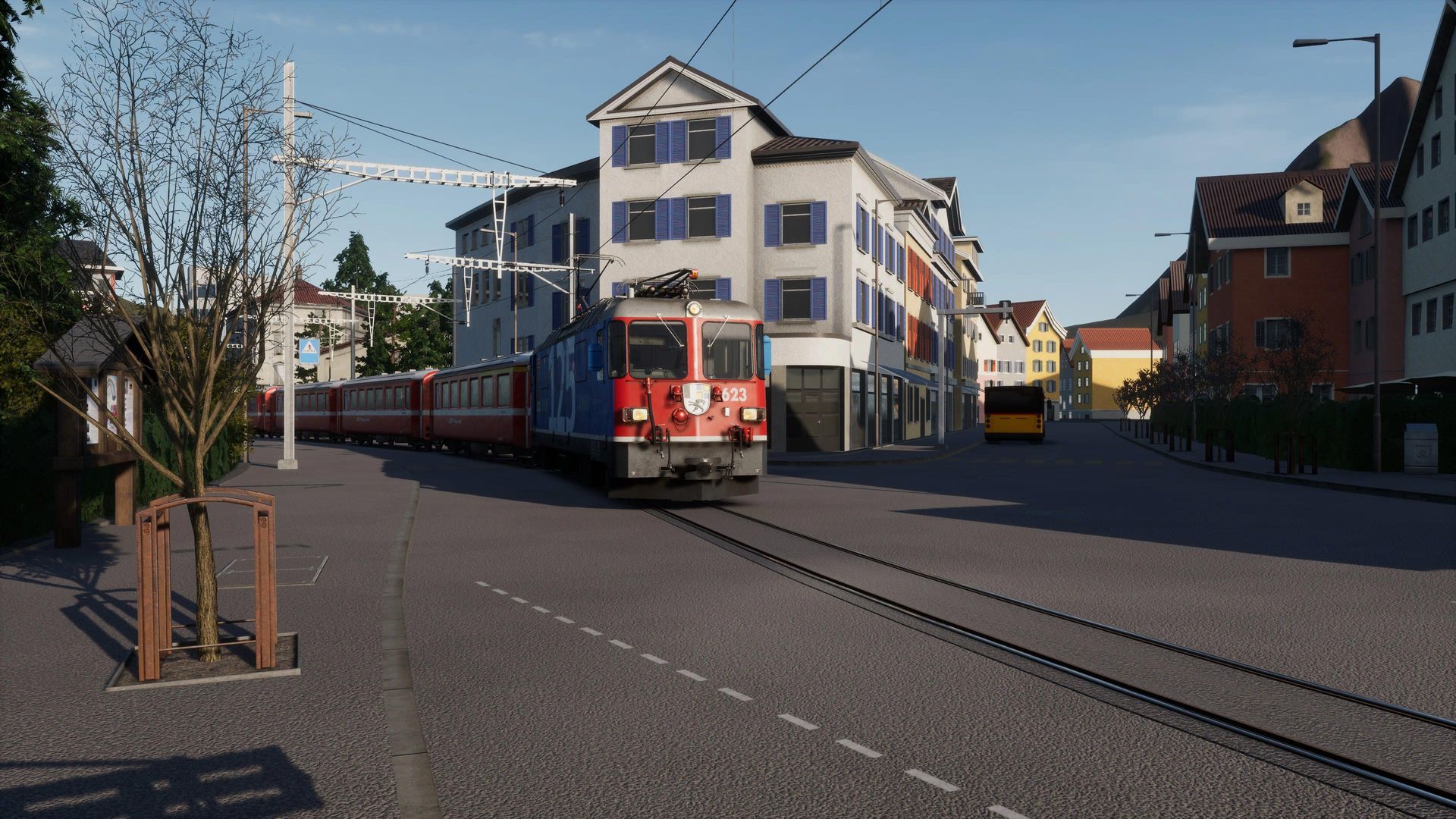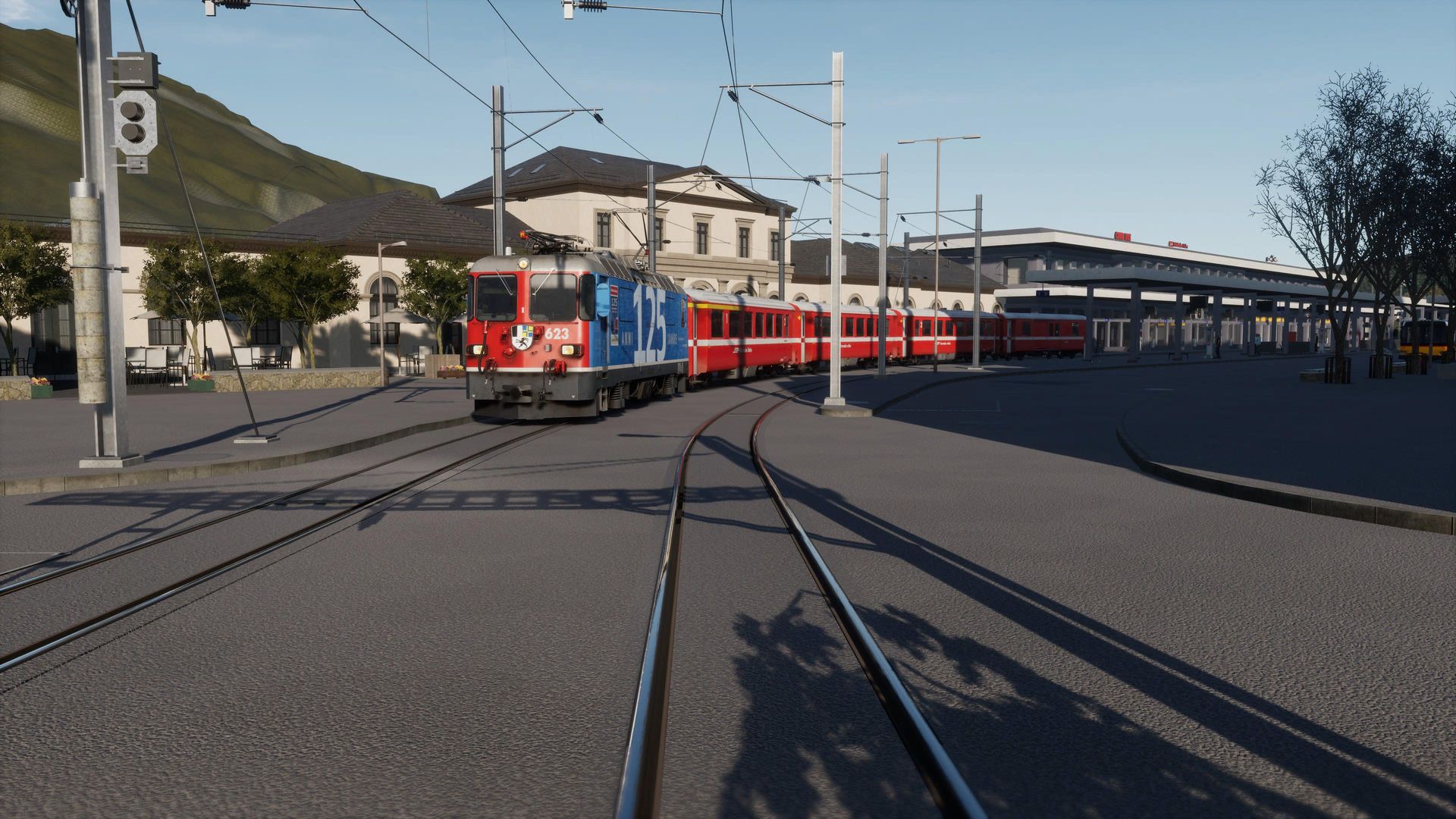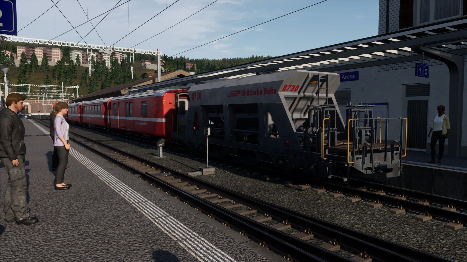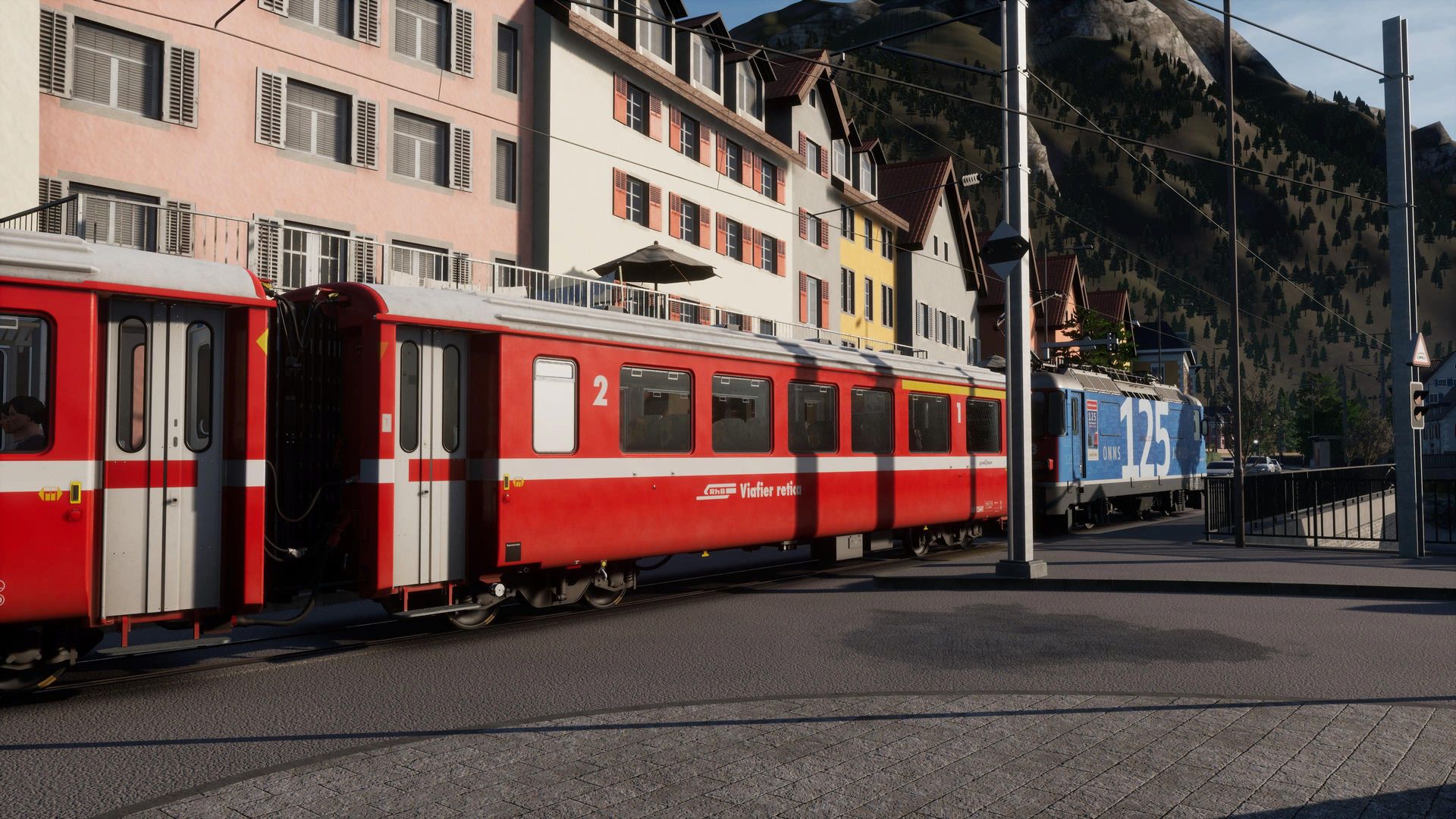 Der Rest hingegen genießt hier fast schon klischeehaftes, schweizer Alpenflair und Gebirgsbahn pur. Auf Straßenbahngleisen schlängeln wir uns vom Bahnhof aus erst einmal mitten durch die Stadt Chur, ehe wir die Stadt Richtung Gebirge verlassen und uns mit bis zu 6% Steigung den Berg auf 1000mm Schmalspurgleisen nach Arosa nach oben schlängeln.