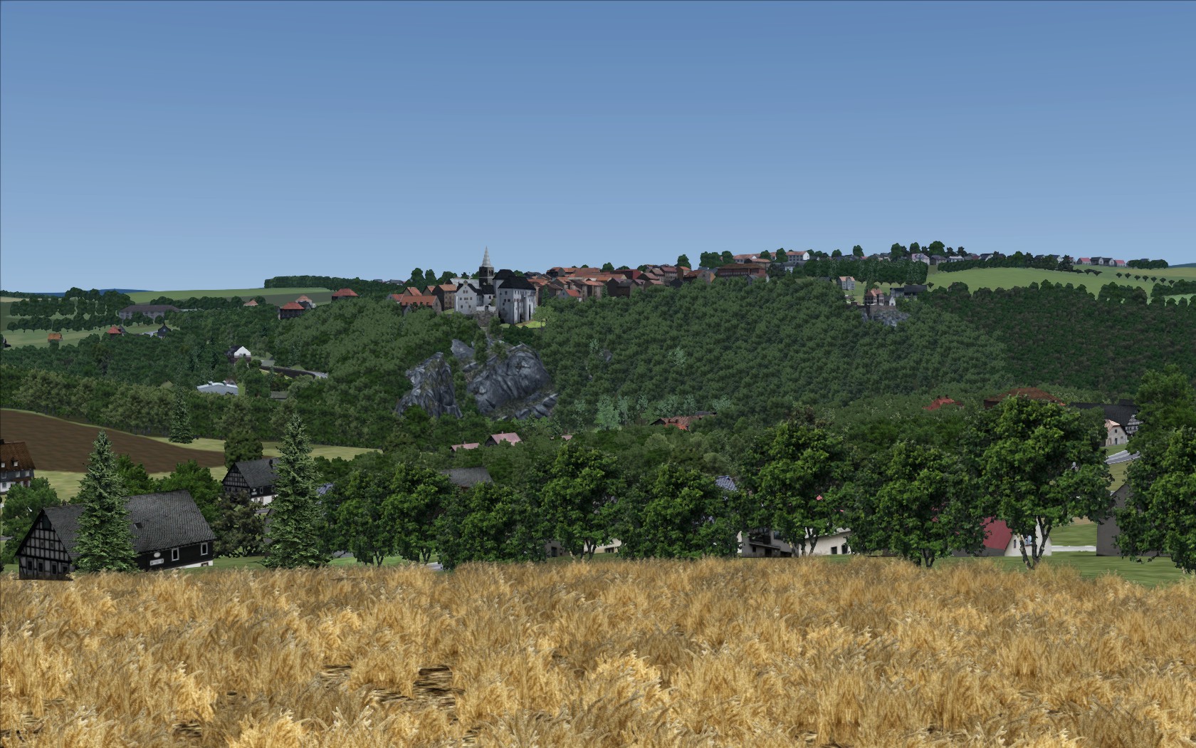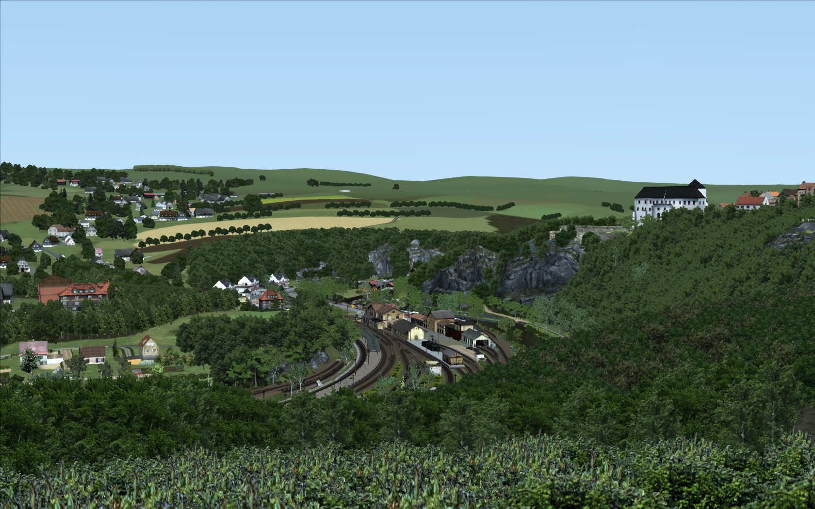 Bevor es zur Abwechslung endlich mal wieder an den Gleisbau geht, worauf ich mich schon sehr freue, wird es Zeit mal wieder zurückzublicken und endlich so manche Jugendsünden zu beseitigen. In weiser Vorraussicht hab ich die grundlegende Überarbeitung und abschließende Details an Wolkenstein für mein zukünftiges Ich aufgehoben, da ich wusste, dass ich mit mehr Erfahrung mit den vorhandenen Assets und potenziell nützliche neu erstellten zurückkommen werde, um dieses Vorhaben vernünftig umzusetzen. Ein erster Teil mit dem Stadtbereich und entlang der Zschopau wurde da bisher zu meiner Zufriedenheit überarbeitet...aber noch liegt da viel Arbeit vor mir. Dank der Aussicht vom Schloß muss ich auch großflächig die nähere Umgebung andeutungsweise nachempfinden, sonst blickt man womöglich nur auf kahle Wiesen