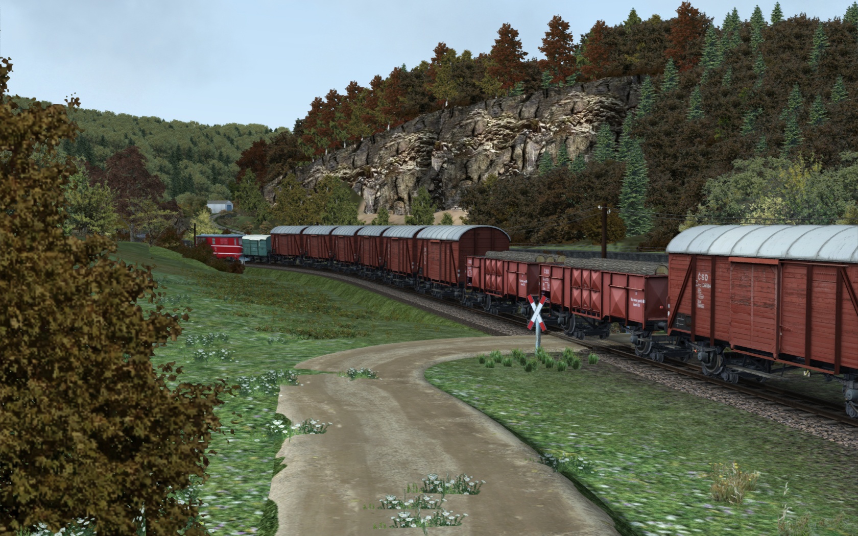 Die arme kleine Diesellok müht sich mit diesem talwärts fahrenden langen Güterzug an einem goldenen Herbstabend sichtlich ab, obwohl der mit 150t noch vergleichsweise ein Leichtgewicht ist. Aber letztlich ist sie dann doch noch heil unter dem Schloss angekommen