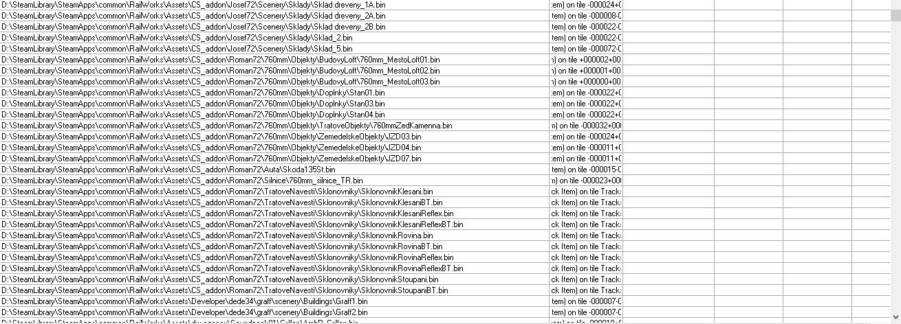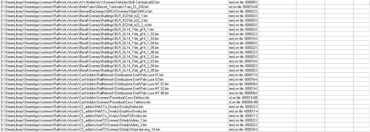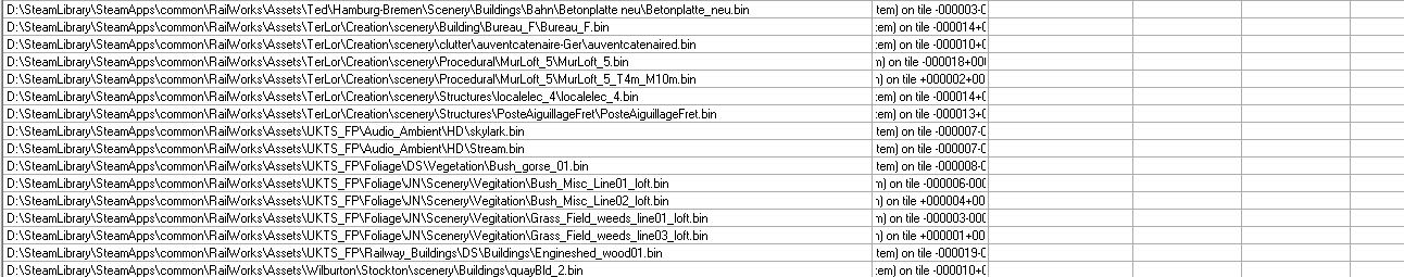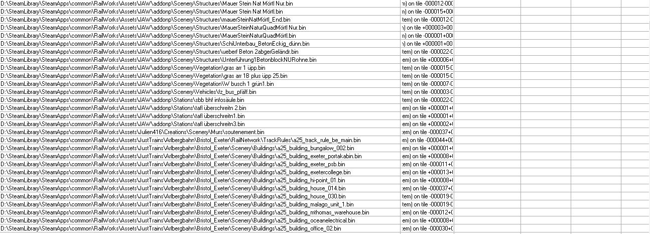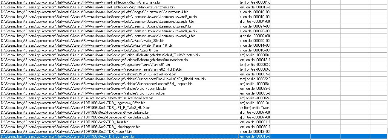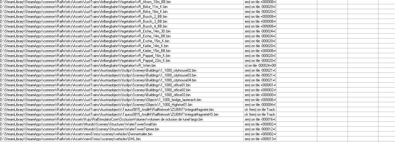 Mir fehlt auch noch eine ganze Menge Zeug (ich habe mal das, was RW-Tools abzüglich Duplikate ausspuckt angehangen). Aber zumindest die Oberleitung habe ich. Mir scheint sehr viel Kleinkram, Grünzeug und einzelne Elemente zu fehlen. Marias Pass habe ich aber auch nicht. Vielleicht kann ja @FMZSchotter Auskunft geben, wo man die Objekte alle her bekommt. Die restlichen DTG/RSC-Strecken werden ja aufgrund des AP-Formats als fehlend angezeigt und können daher ignoriert werden. -