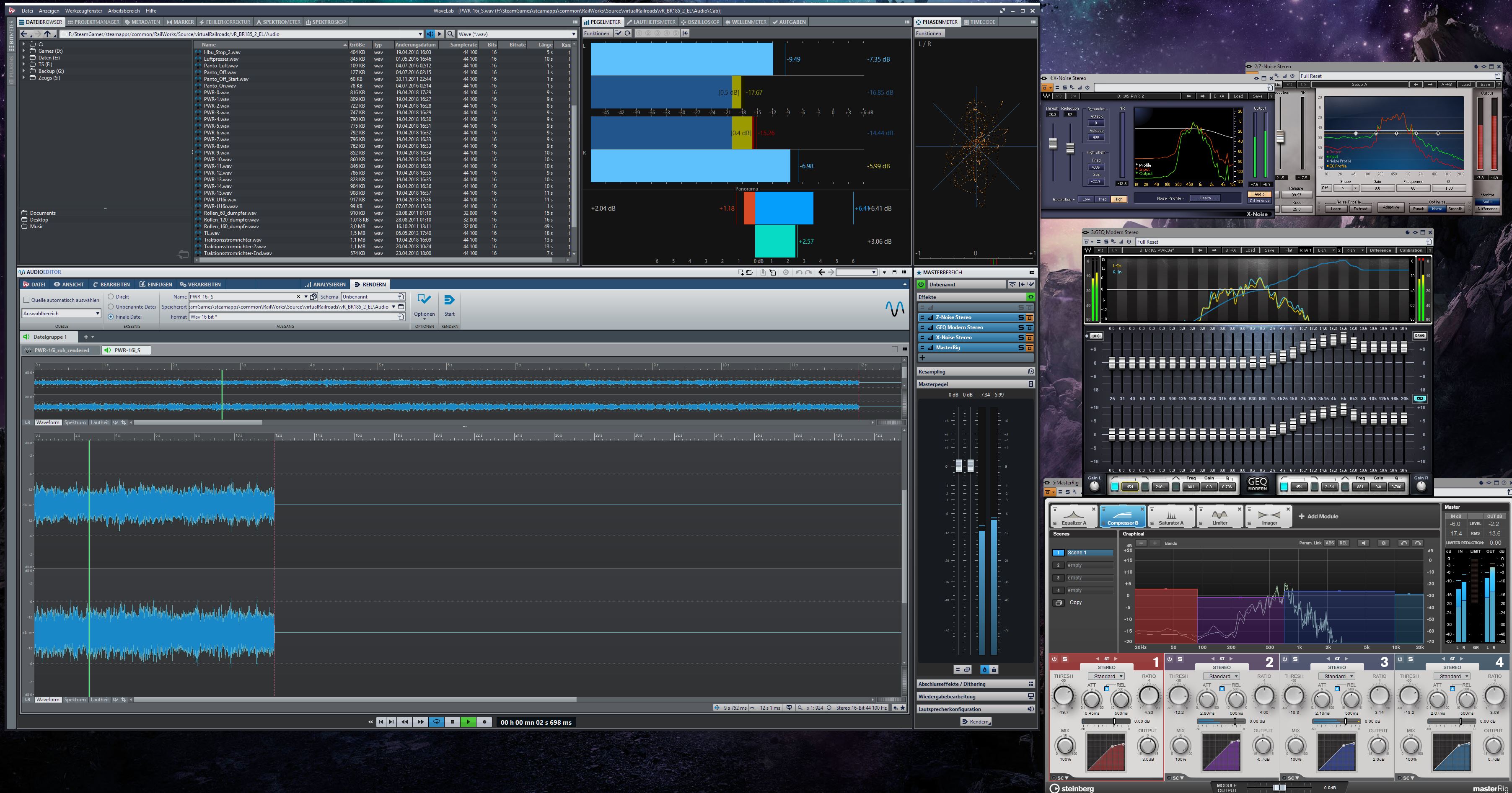 Aber wie man weiß, Audioschnipsel die von schlechter Hadrware kommen, ..da kann man auch mit guter Studiosoftware keine guten Ergebnisse erzielen, allenfalls Klngverbesserungen..mit anderen Worten Aufnahmegeräte und Microphone machen die Musik. Es sei denn man erzeugt den Sound komplett virtuell.Ja, da bist du halt doch auf dem Holzweg. Das ist doch genau der Grund warum diese Software zum Einsatz kommt. Wären die Quellen top, bräuchte man nur ein simples Audio-Schnittprogramm, das ist wahr. Aber wenn die Quellen eben alles andere als gut sind, dann ist diese masse an Software nötig und auch ihr Geld wert. Ich warte seit Monaten auf Quellen zur Lok, kommen aber keine, weil es bisher unmöglich war an eine Lok ranzukommen. Beispiel die Tonleiter der 185. Die vorhandene Quelle ist keine 2 Sekunden lang. Darin verbergen sich also die 15 Tonstufen und allerlei anderer Mist. Das bekommst du mit keinen normalen Schnittprogramm loopfähig herausgelöst. Dazu war es eben nötigt mit drei verschiedenen Programmen (Reason (Grain), Mach5 (ircam Granular) und eben Wavelab) und dem Einsatz von diversen dieser Waves Plugins über Tage hinweg daran zu fummeln. Alternative wäre gewesen: keine Tonleiter. Also ist der Einsatz doch wohl gerechtfertigt? Es ist nötig und sehr effektiv. Ich muss halt in kürzester Zeit ein Ergebnis schaffen und das geht nur mit massiven Einsatz von jahrzehntelang praxiserprobter Software. Audacity und wie die alle heisen, liefert kein Ergebnis in der kurzen Zeit.