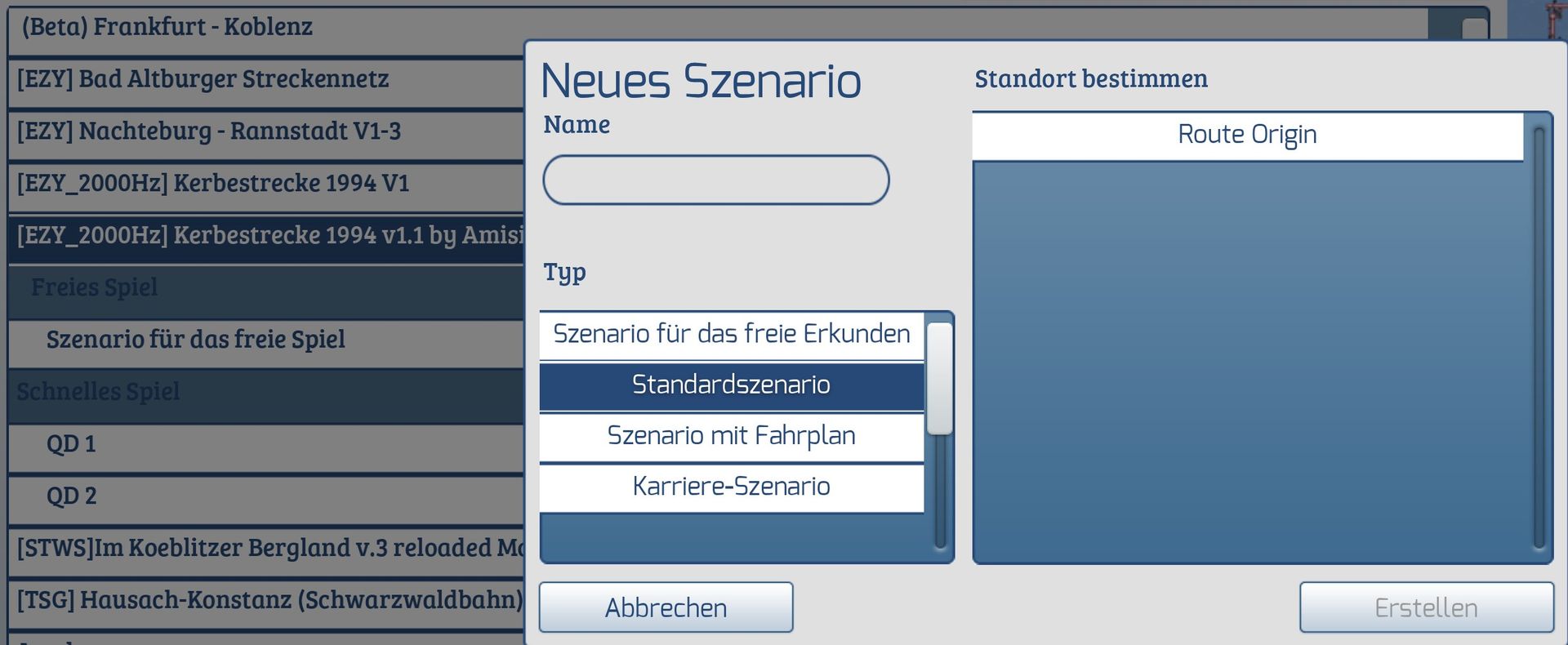 Heute wollte ich mir ein neues Szenario auf der Kerbestrecke 1.1 (by Amisia) erstellen. Zu meinem Erstaunen sehen ich aber keine Standorte in der Auswahl. Das einzige was angezeigt wird ist die Route Origin. Dasselbe bei der Kerbestrecke V1. Bei anderen Strecken gibt es das Problem nicht.