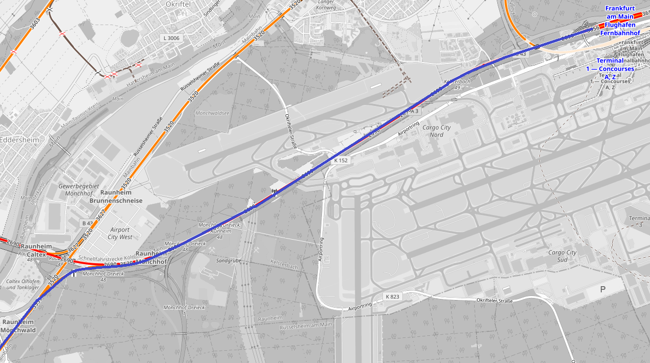 BR-218 Danke für die Mühe. Habe vergessen, dass ich den Fernbahnhof und nicht den Regionalbahnhof meinte. Nicht oben über Kelsterbach sondern vom Fernbahnhof in Richtung Mainz auf dem Gegengleis bis zur Verbindungskurve, wo es dann Richtung Süden geht.