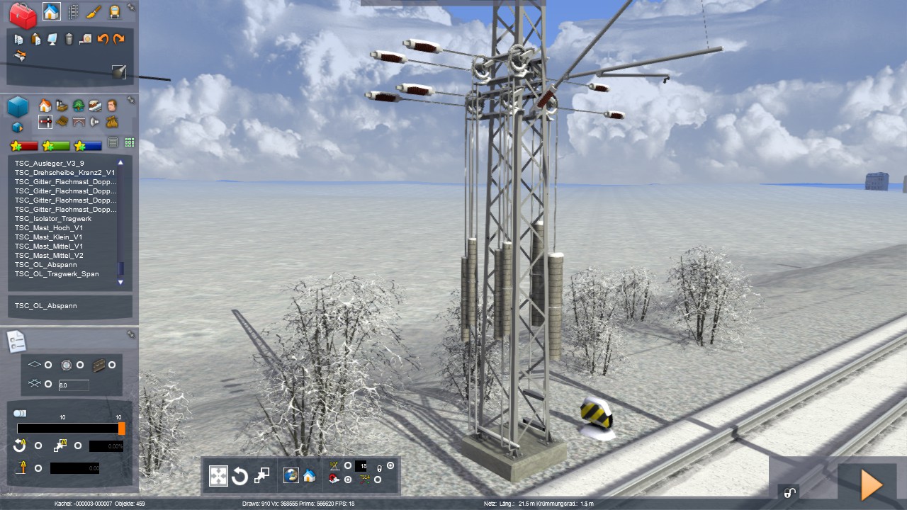 gerade arbeiten wir an einer neuen Oberleitung nach dem Prinzip der Hamburg-Hannover-Oberleitung mit weiteren und verfeinerten Möglichkeiten, welche wir euch hier gerne vorstellen möchten. Geplant sind grüne und graue Stahlmasten, sowie Betonmasten. Quertragwerke in verschiedenen Längen, sowie in den Farben grün und grau gehören ebenfalls mit ins Sortiment, genauso wie Gittermasten verschiedener Auslegerlängen. Natürlich wird es auch Wintertexturen zu den Objekten geben.
