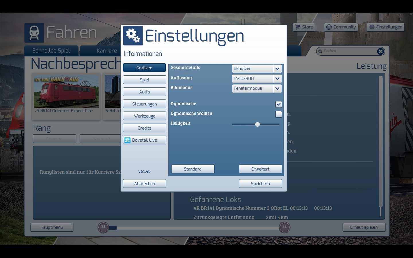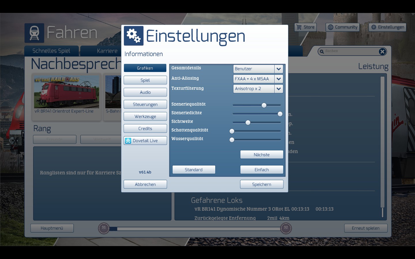 ... weswegen ja der TS erst so spät hoch kam. Mein Windows 10 bekomme ich auf 1,2GB RAM Verbrauch runter geschraubt. Grafik ist eher das Manko, wenn man keine neuere Grafikkarte hat, in meinen Augen. Ich fahre auch in Konstanz Villingen im TS...Ich habe das Spiel auch nur auf 1400x900, weil ich am Szenario bauen bin, im normalen Fahrmodus fahre ich nciht im Fenster und mit maximaler Auflösung meines Monitors 1920x1080 ...