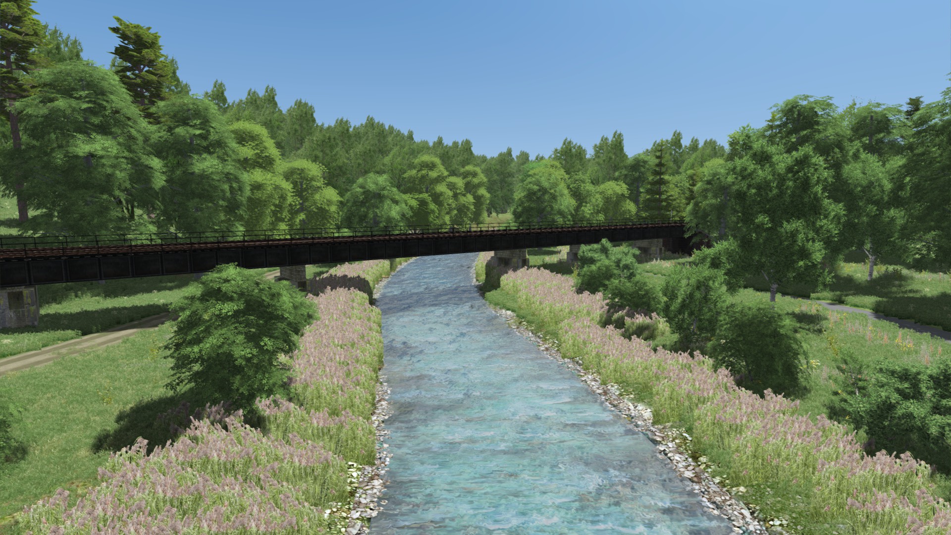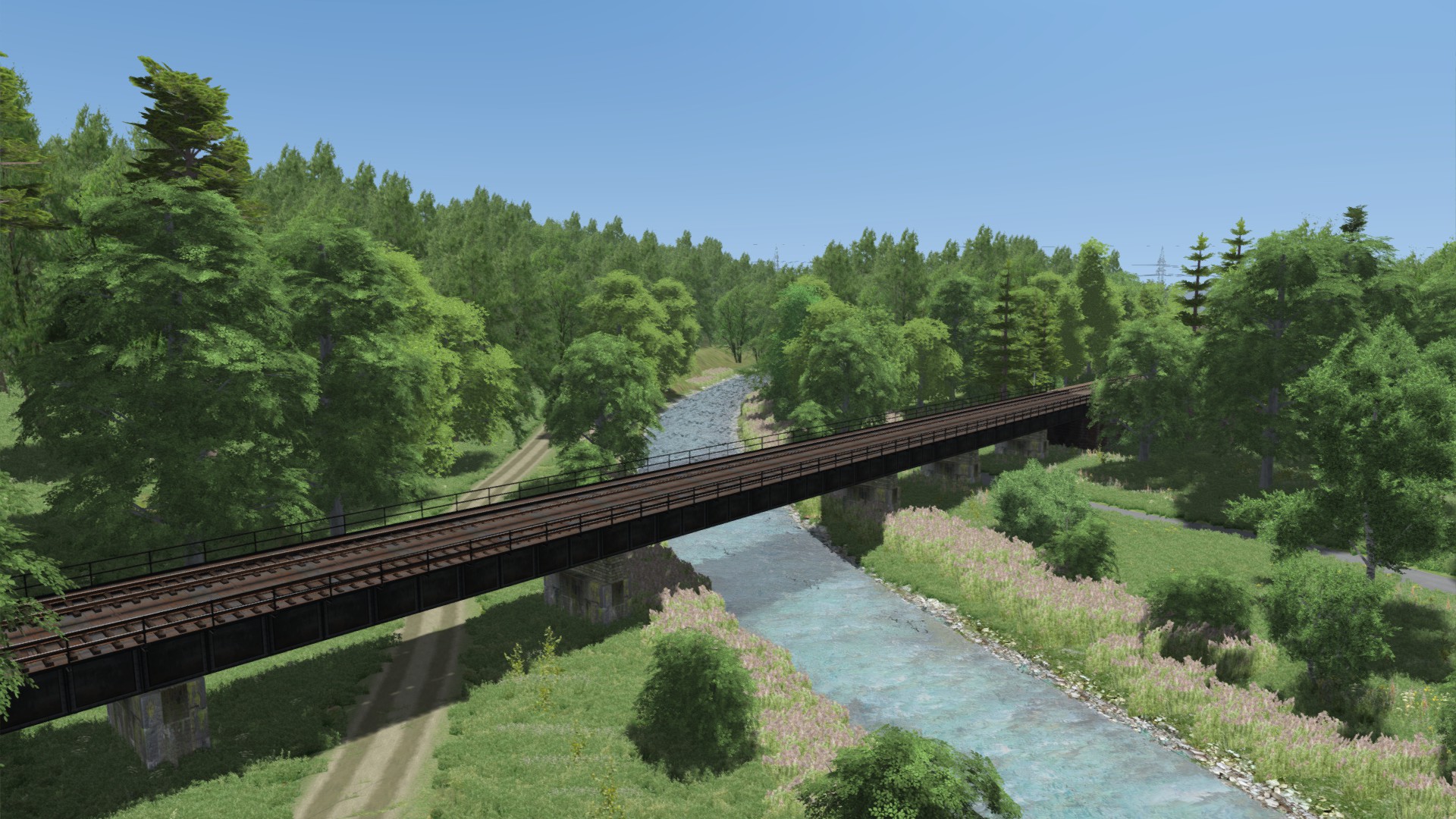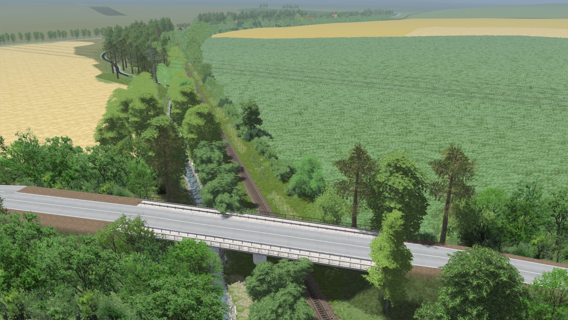 Letzte Innerstequerung kurz vor dem Stadtgebiet von Hildesheim. Ich schlage mich bereits mit den ersten paar Hundert Metern im Stadtgebiet herum und stoße da an meine Grenzen. Vor Hildesheim befindet sich ein riesiges Wirrwarr aus Straßen/Fußgänger Unterführungen, die warscheinlich nicht 100% realitätsgetreu umsetzen kann. Die Strecke im Stadtgebiet ist eh von Bäumen und Büschen gesäumt und man erkennt nicht viel von Hildesheim aus dem Führerstand. Entsprechend wird das Stadtgebiet auf "Sparflamme" ausgestaltet und endet nach wenigern hundert Metern an Baumreihen.