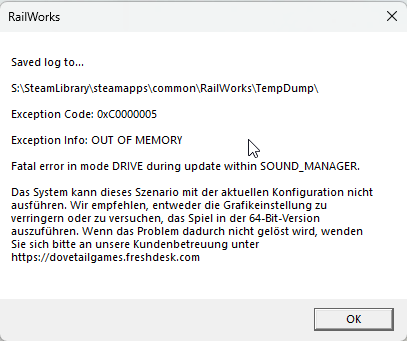 Alles anzeigenSaved log to... S:\SteamLibrary\steamapps\common\RailWorks\TempDump\ Exception Code: 0xC0000005 Exception Info: OUT OF MEMORY Fatal error in mode LOAD_BLUEPRINT. Das System kann dieses Szenario mit der aktuellen Konfiguration nicht ausführen. Wir empfehlen, entweder die Grafikeinstellung zu verringern oder zu versuchen, das Spiel in der 64-Bit-Version auszuführen. Wenn das Problem dadurch nicht gelöst wird, wenden Sie sich bitte an unsere Kundenbetreuung unter https://dovetailgames.freshdesk.comIch habe mich schon an diversen Konfigurationen verausgabt, jedoch bricht weiterhin jeder Ladevorgang der Strecke mit obiger Meldung ab und es wird, wie üblich, ein Crash Report erzeugt. Zum letzten Ladevorgang habe ich ihn angehängt. Hat jemand eine Idee, wieso das Problem ausschließlich auf die Rodachtalbahn spezifiziert ist und wie ich das beheben kann?