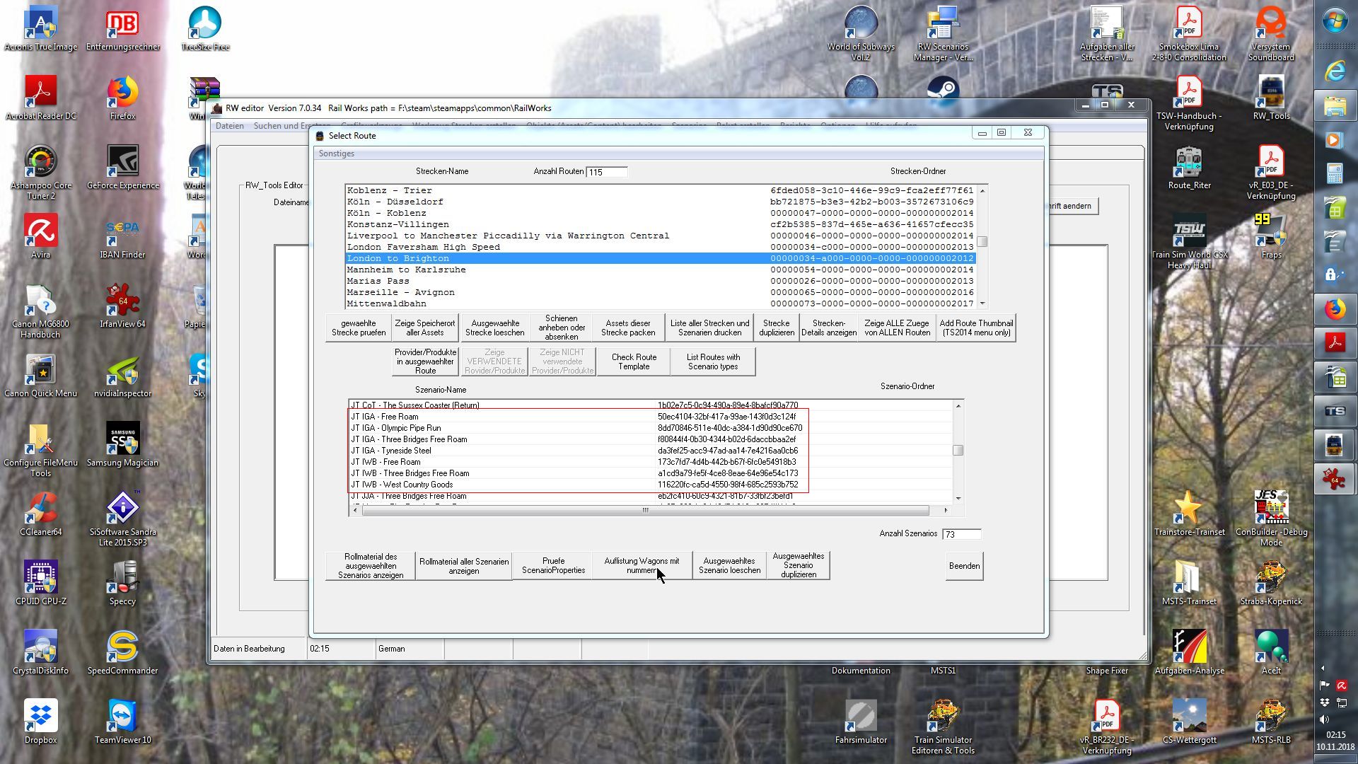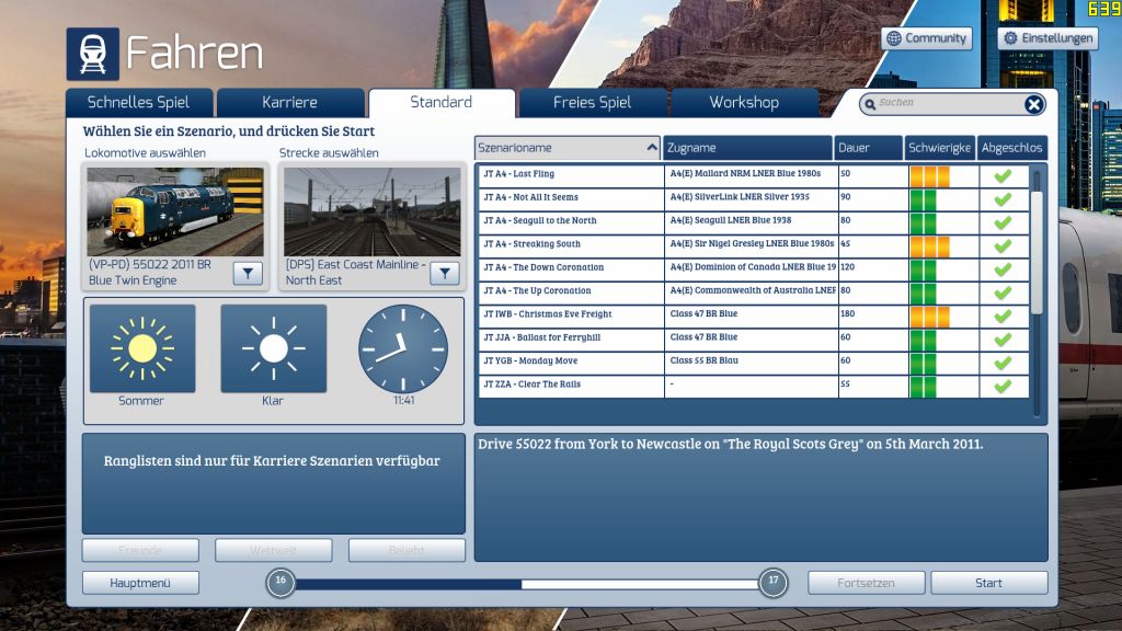 Hm, das Löschen der Szenario-Ordner und die Deinstallation der beiden Wagen hat nichts gebracht. Die meisten Szenarien landen im Spiel auf der "London to Brighton"-Strecke. In der Rubrik "Freies Spiel" habe ich auch noch die Strecke "London nach Brighton"...