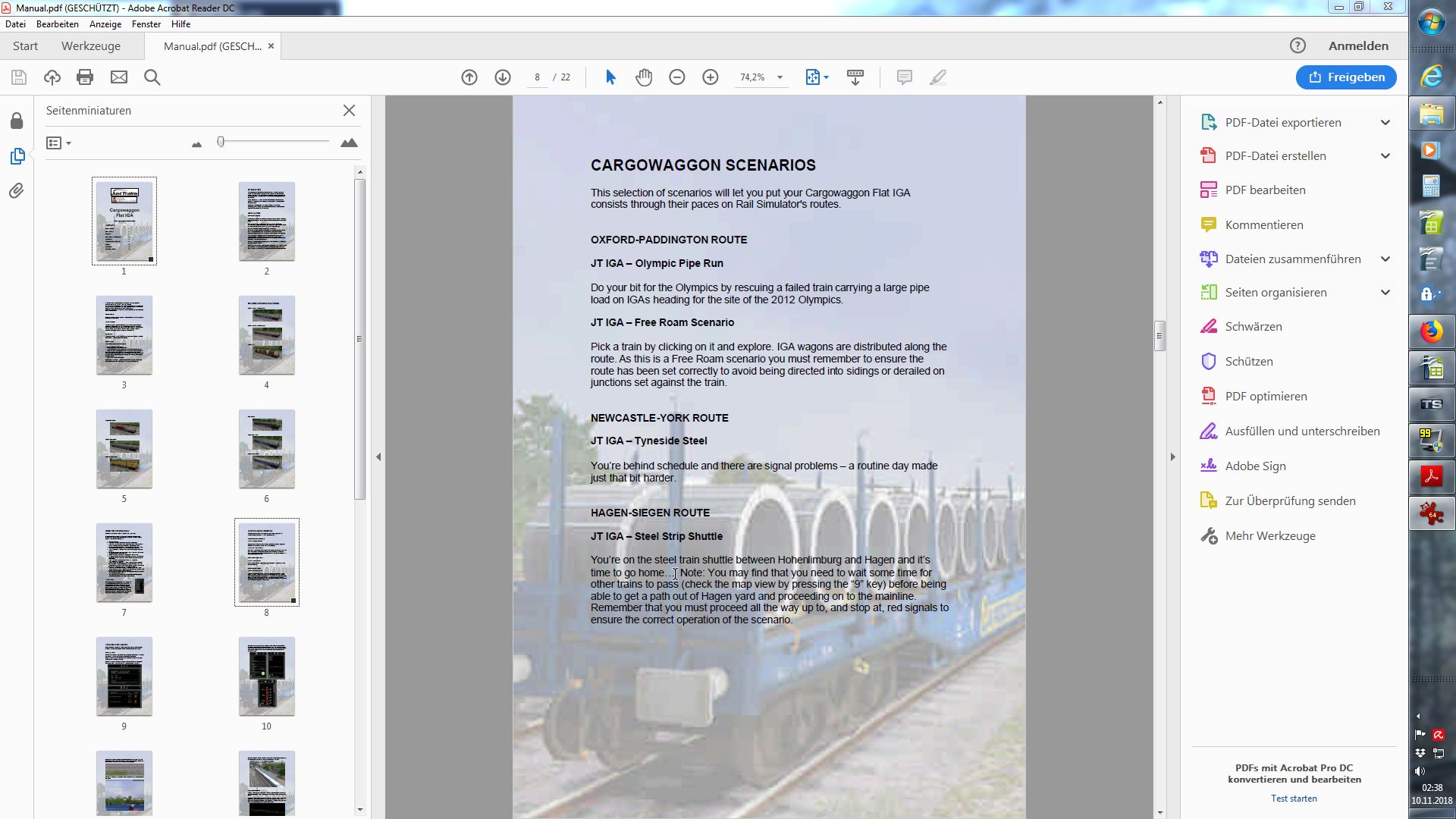 @Loco-Michel Ja, dessen bin ich mir bewußt, aber die Szenarien sind in der London - Brighton-Strecke, obwohl sie da laut Handbuch gar nicht hingehören. In der Strecke Hagen - Siegen sind im Spiel die Szenarien für den IWB- und den IGA-Wagen gar nicht vorhanden, weder werden sie dort von RWT angezeigt noch in der Aufgabenliste der Strecke "Hagen - Siegen"