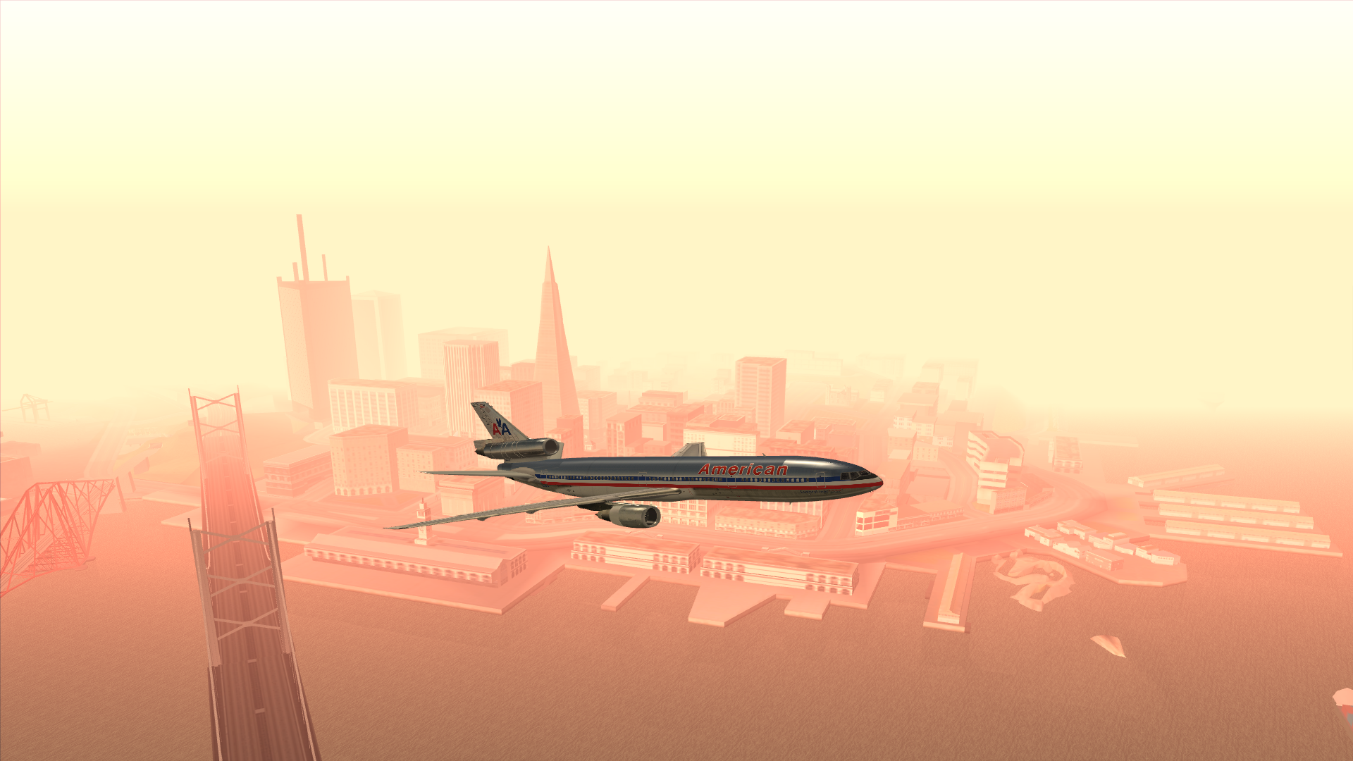 Mal wieder die große Maschine in GTA San Andreas geflogen. Hier fliegt die gute DC-10 gerade am Panorama von San Fierro vorbei.