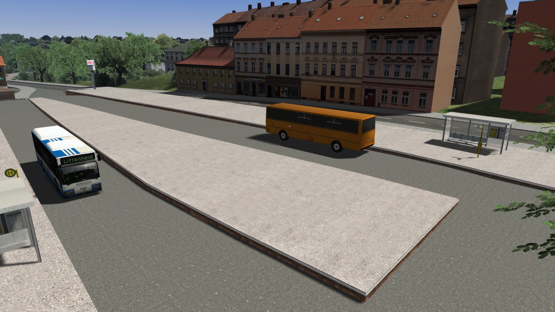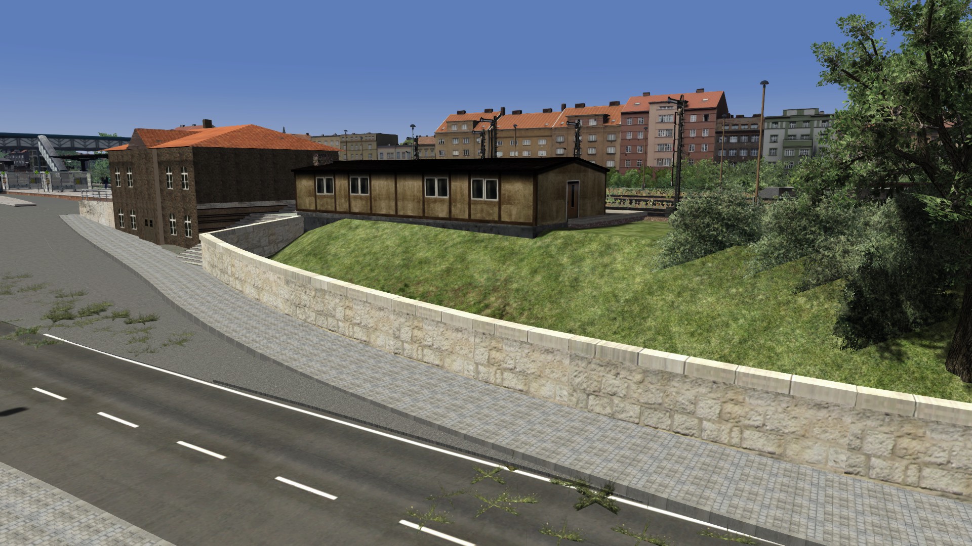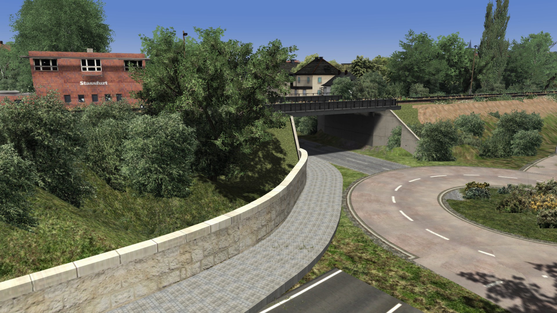 Ich habe wieder ein paar Bilder für Euch vom Umbau. Bitte nicht an der Vegetation und den verbauten Häusern stören lassen das wird später noch angepaßt wenn alle Straßen fertig sind. Die Mauer auf der Bahnseite steht wieder neu und die Steinbrücke ist auch durch ein anderes Model ersetzt worden. Der Busbahnhof ist auch soweit fertig allerdings nicht ganz original sondern etwas der Zeit angepaßt. Es fehlt nur etwas Grünzeug und Markierungen.