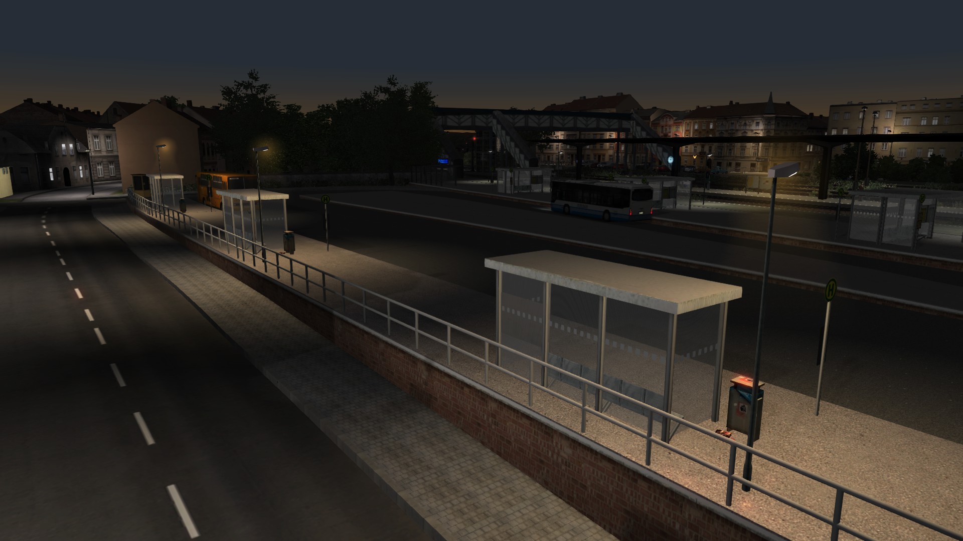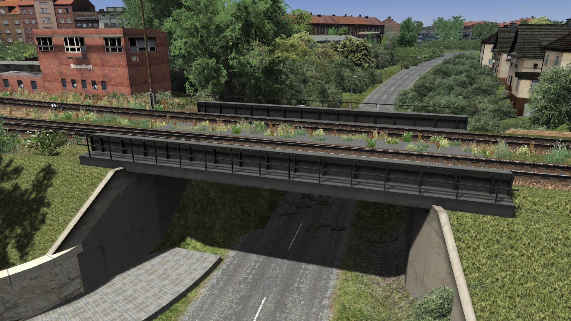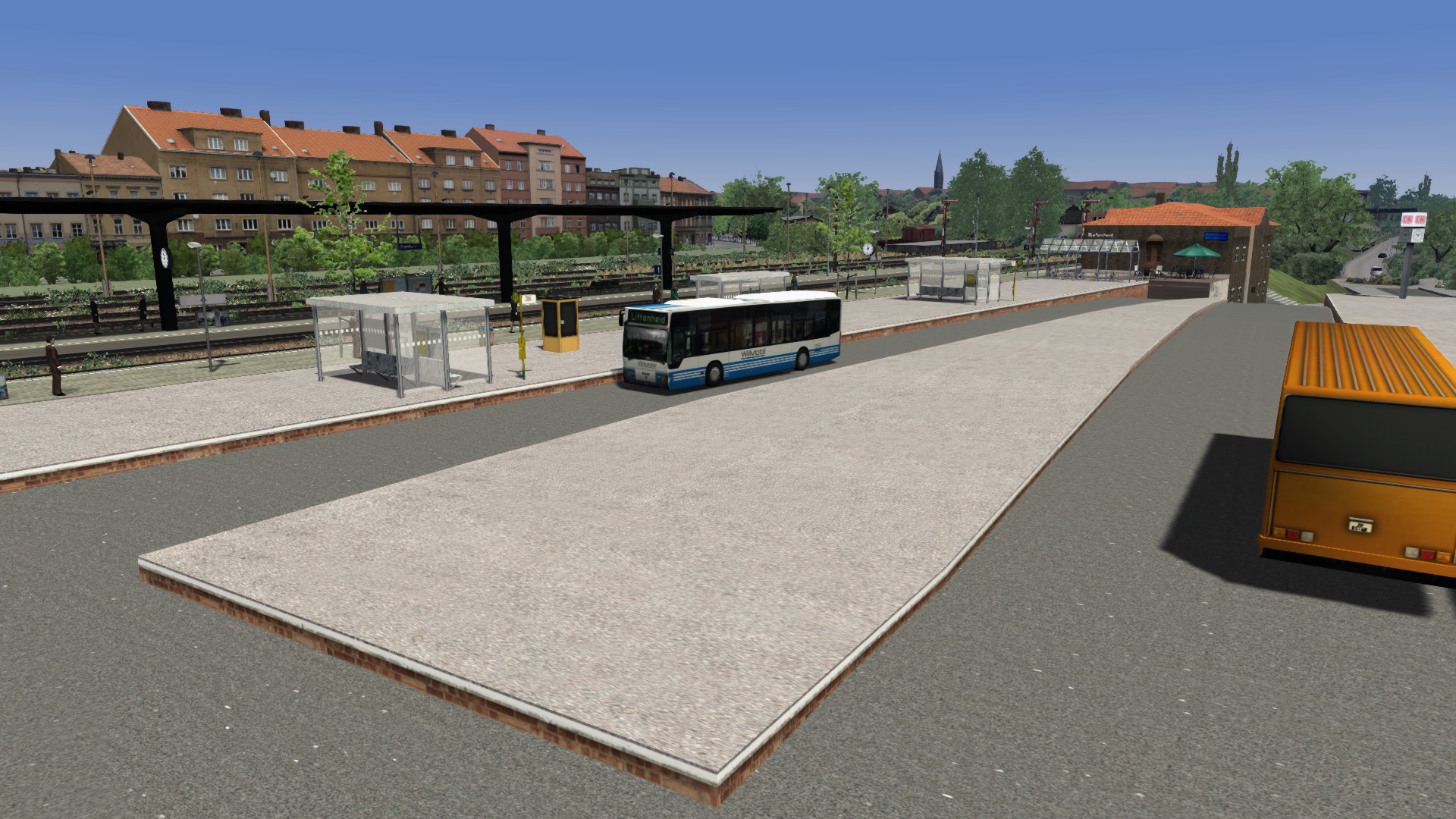 Ich habe wieder ein paar Bilder für Euch vom Umbau. Bitte nicht an der Vegetation und den verbauten Häusern stören lassen das wird später noch angepaßt wenn alle Straßen fertig sind. Die Mauer auf der Bahnseite steht wieder neu und die Steinbrücke ist auch durch ein anderes Model ersetzt worden. Der Busbahnhof ist auch soweit fertig allerdings nicht ganz original sondern etwas der Zeit angepaßt. Es fehlt nur etwas Grünzeug und Markierungen.