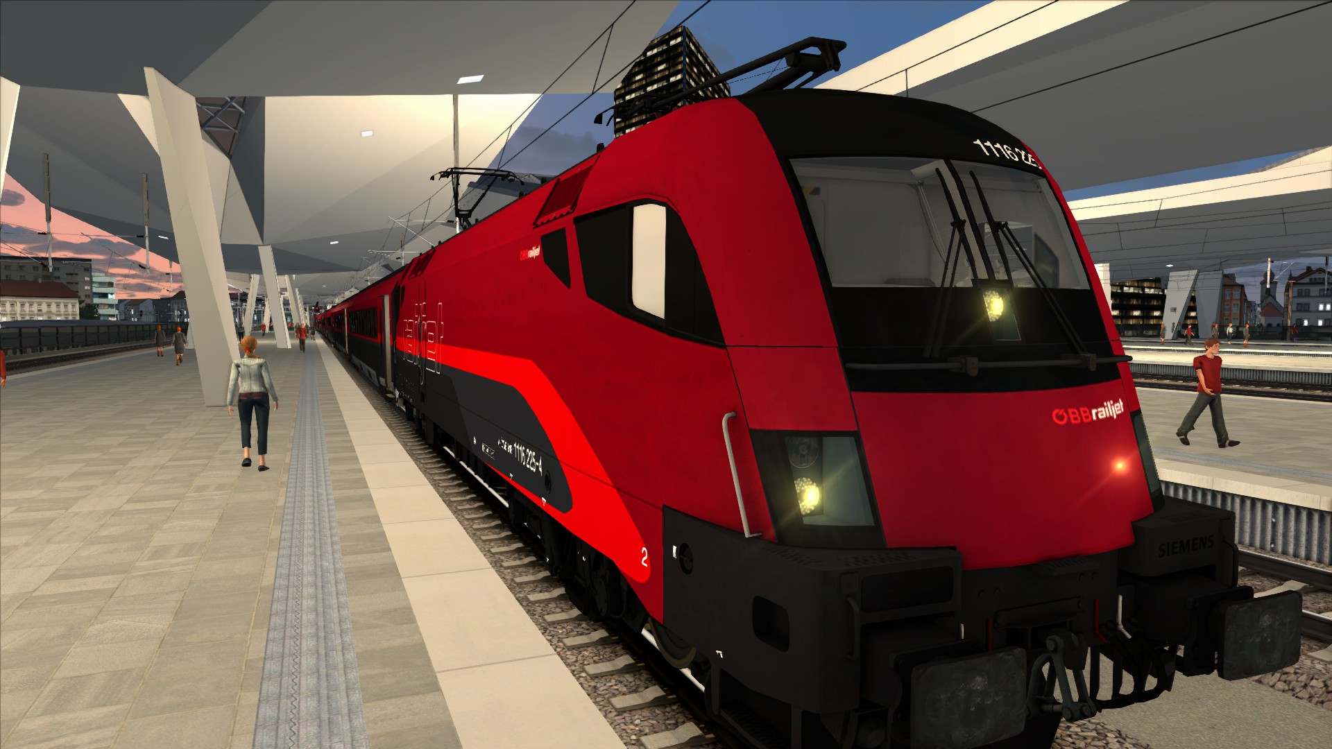 Bild 3 & 4 zeigen einen Railjet der im Wiener Hbf steht. Das 5. Bild zeigt ein Stück vom Wiener Hbf bei Sonnenuntergang.