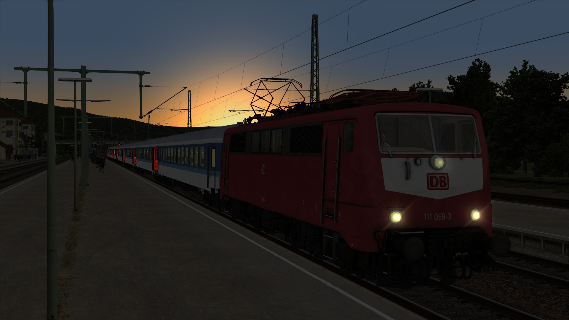 111 068-3 beim Sonnenaufgang mit einem Interregio.