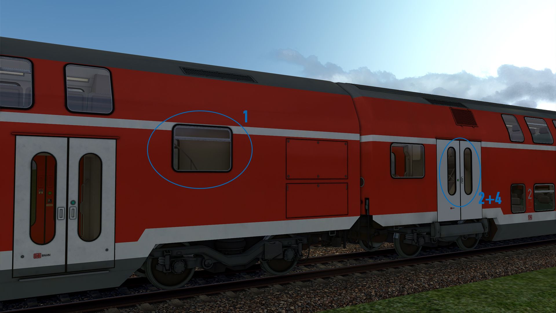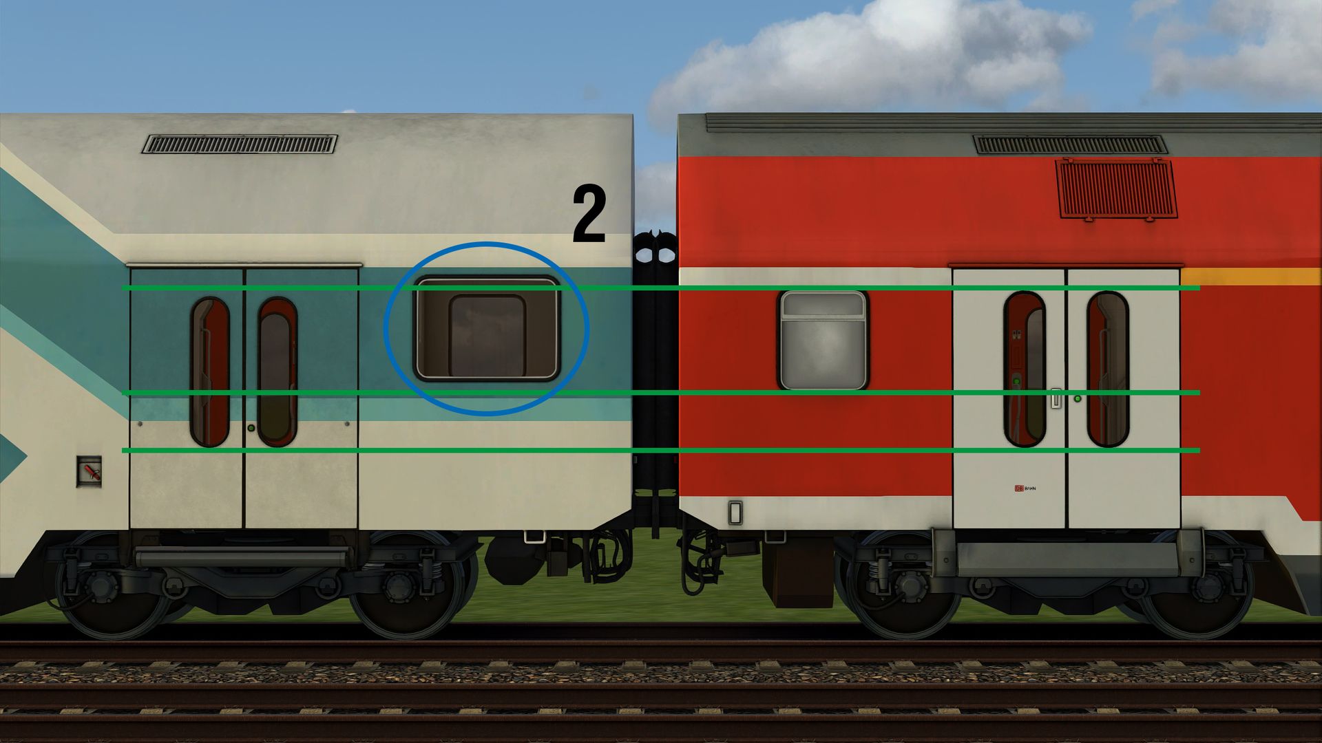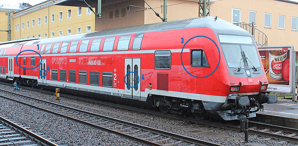 - Die Fenster im Bereich der Wagenübergänge sind in Relation zum weißen Strich der Klassenmarkierung zu hoch, denn die obere Kante der Fenster endet real unterhalb des weißen Striches und nicht auf dem Strich. Für den Mittelwagen siehe Vergleichsbilder von vt_professional, für den Steuerwagen vgl. angehängtes Bild und Bilder auf dieser Seite.