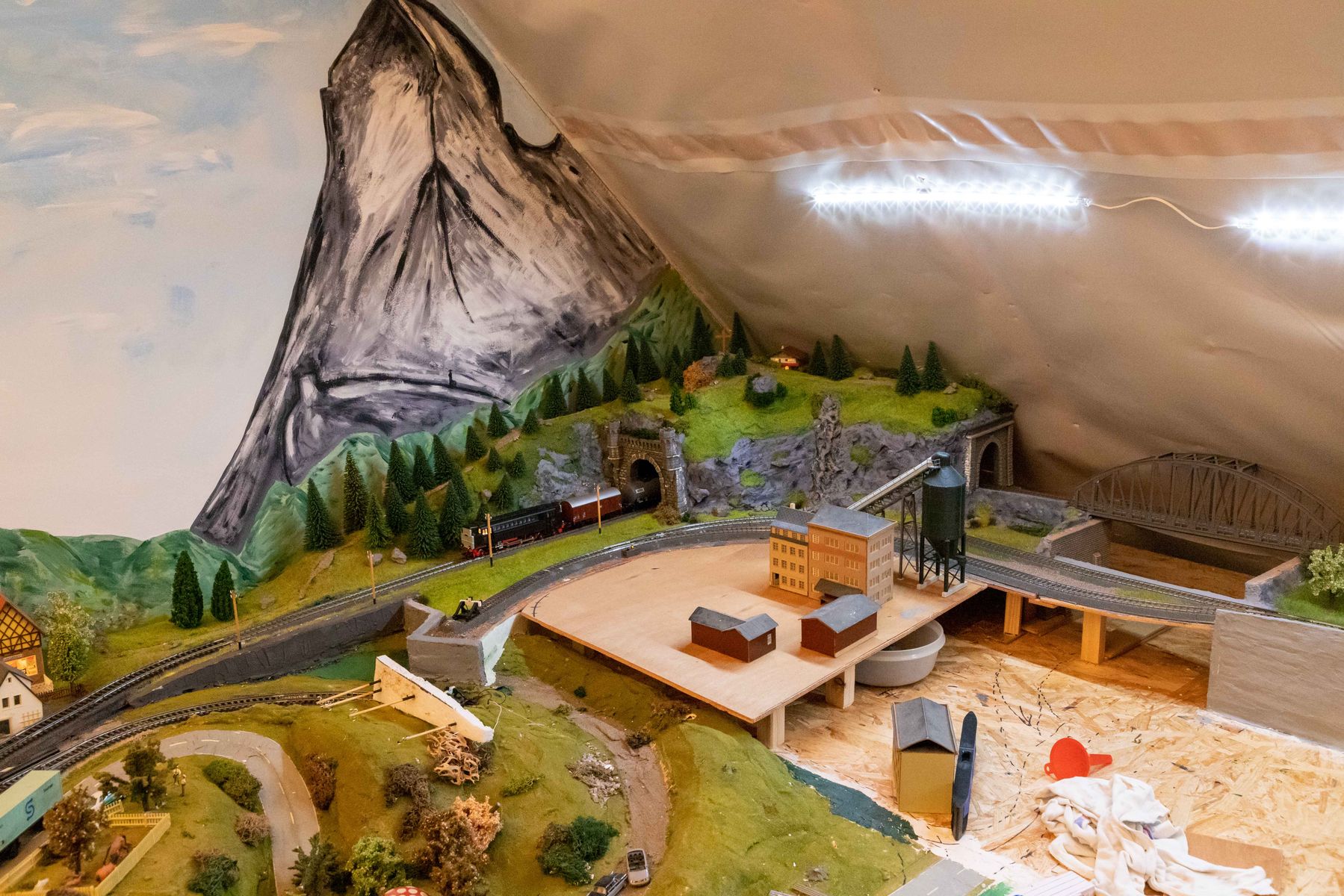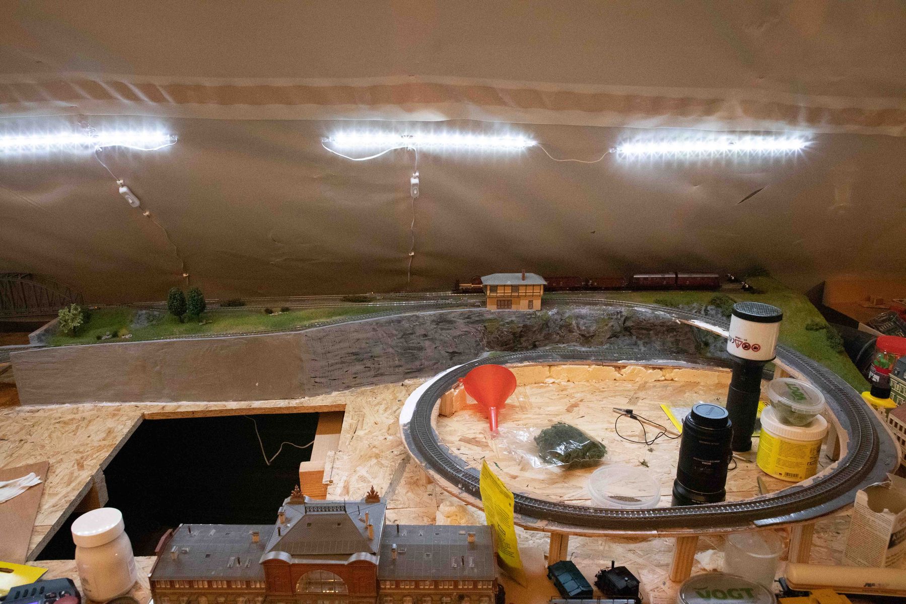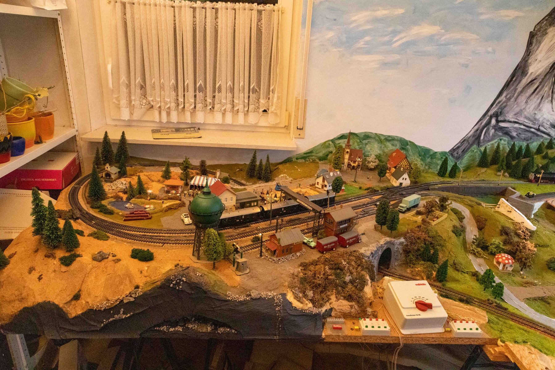 ich dachte ich stelle hier mal ein paar Bilder von meiner im Moment im bau befindlichen Anlage rein. Die Anlage ist die Erfüllung eines lange gehegten Traumes, meine alte Märklin H0 8-Anlage zu erweitern. Geesteuert wird un alles mit Digital über die Mobile Station 2, Weichen werden weiterhin analog über die Stellpulte gesteuert, der Strom für die Weichen und Lichter kommt vom alten analgo Transformer. Vieles wurde handgemacht, beispielsweise Strommasten u.ä., der Rest von namhaften Herstellern als Bausätze gekauft. Einige der Gebaude auf dem neuen Teil wurden mir durch die Aufgabe einer anderen Anlage übergeben, mal sehen, ob ich da das ein oder andere nicht wieder hünbsch machen kann. Die Bergasung erfolgt elektrostatisch mit dem Gasmaster von Noch.