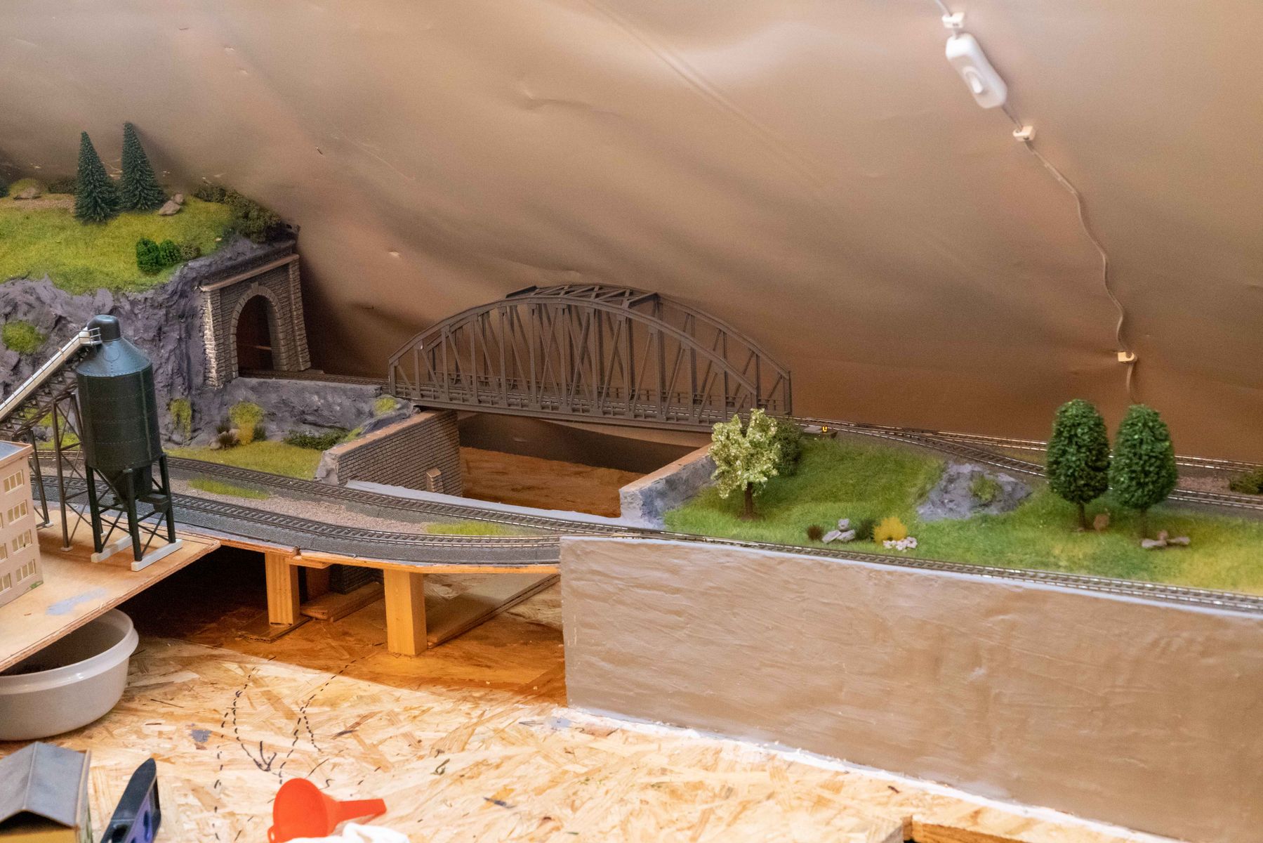 Im Moment warte ich gerade auf die Lieferung von 2 Gebäuden von Joswood, derweil gibt es eine erste Stellprobe vom Kies/Betonwerk in der Ecke. Sobald die Gebäude da sind kann es da weiter gehen.