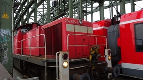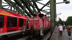 Eine 294 überquert die Hohenzollernbrücke mit 363 im Schlepptau.
