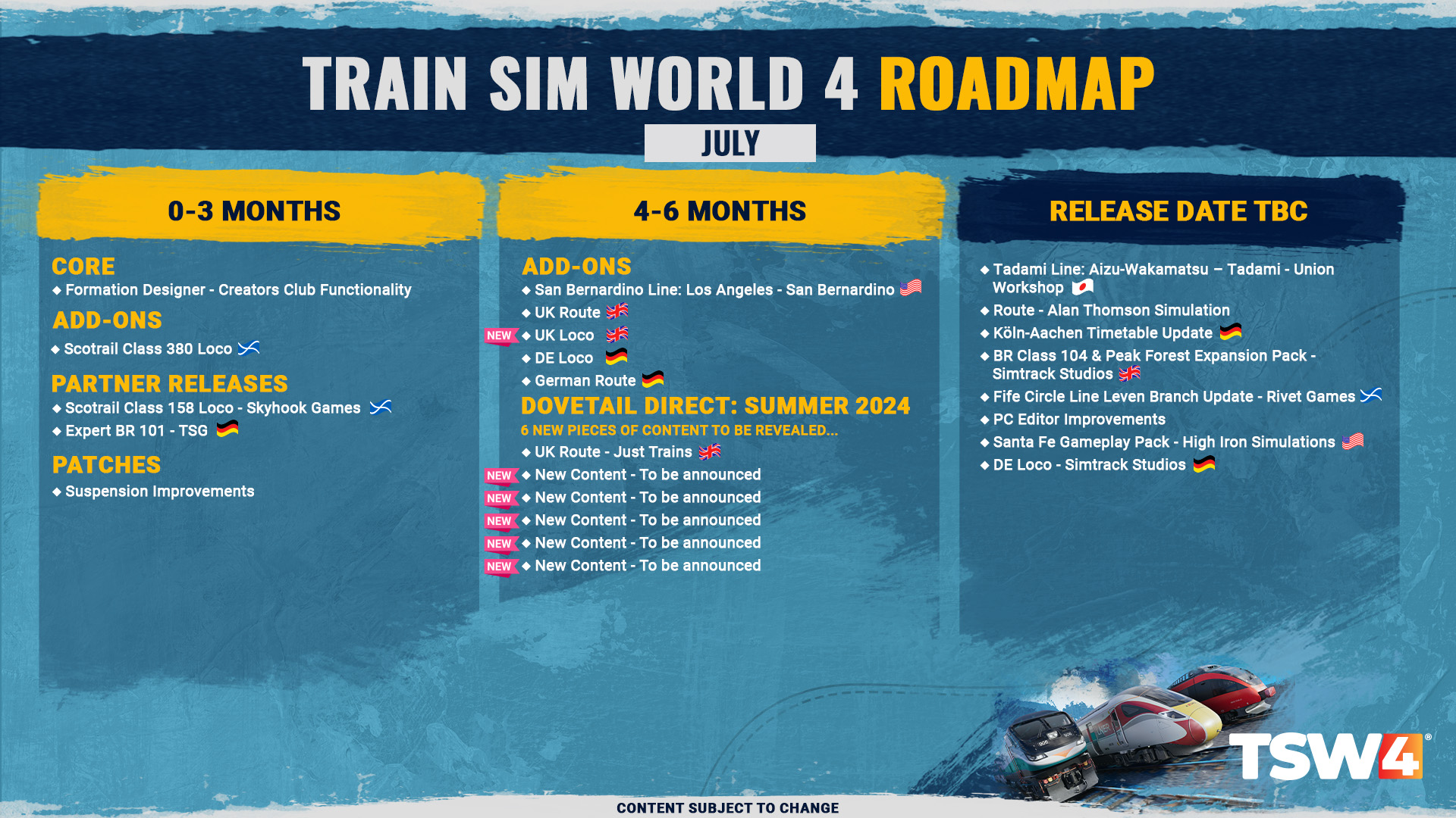Beim Dovetail Direct im Sommer 2024 werden die bekannten Gastgeber Matt, JD, Alex und Cat sowie einige neue Gesichter zurückkehren, um über die Entwicklungen bei Train Sim World zu sprechen. Dabei werden sie nähere Details zu einigen der noch unbenannten Strecken und Lokomotiven geben, die in der jüngsten Juli-Roadmap-Infografik erwähnt wurden, einschließlich der 6 neuen hinzugefügten Strecken.