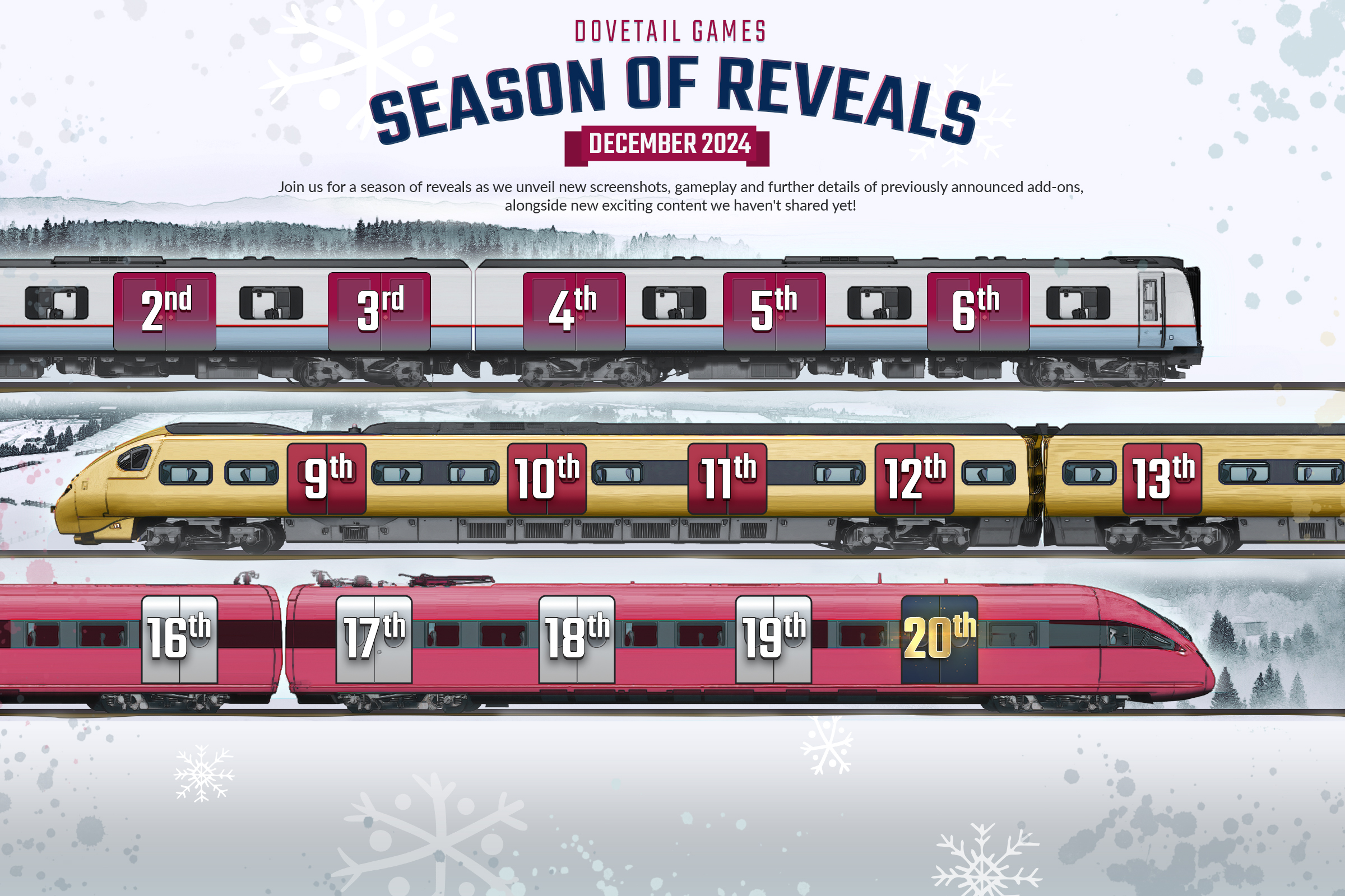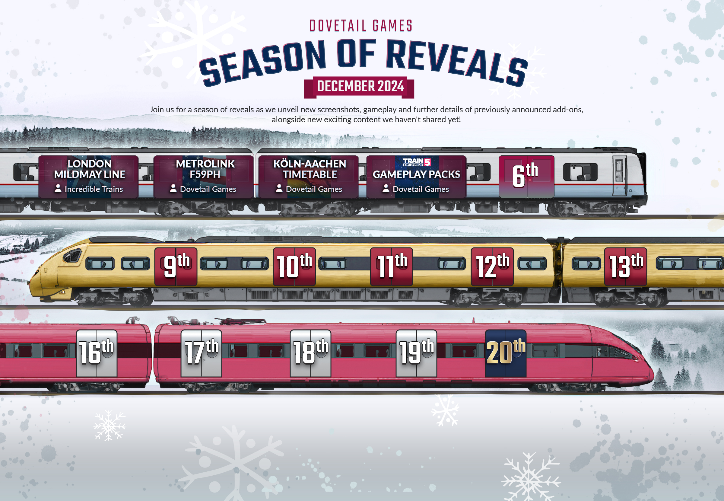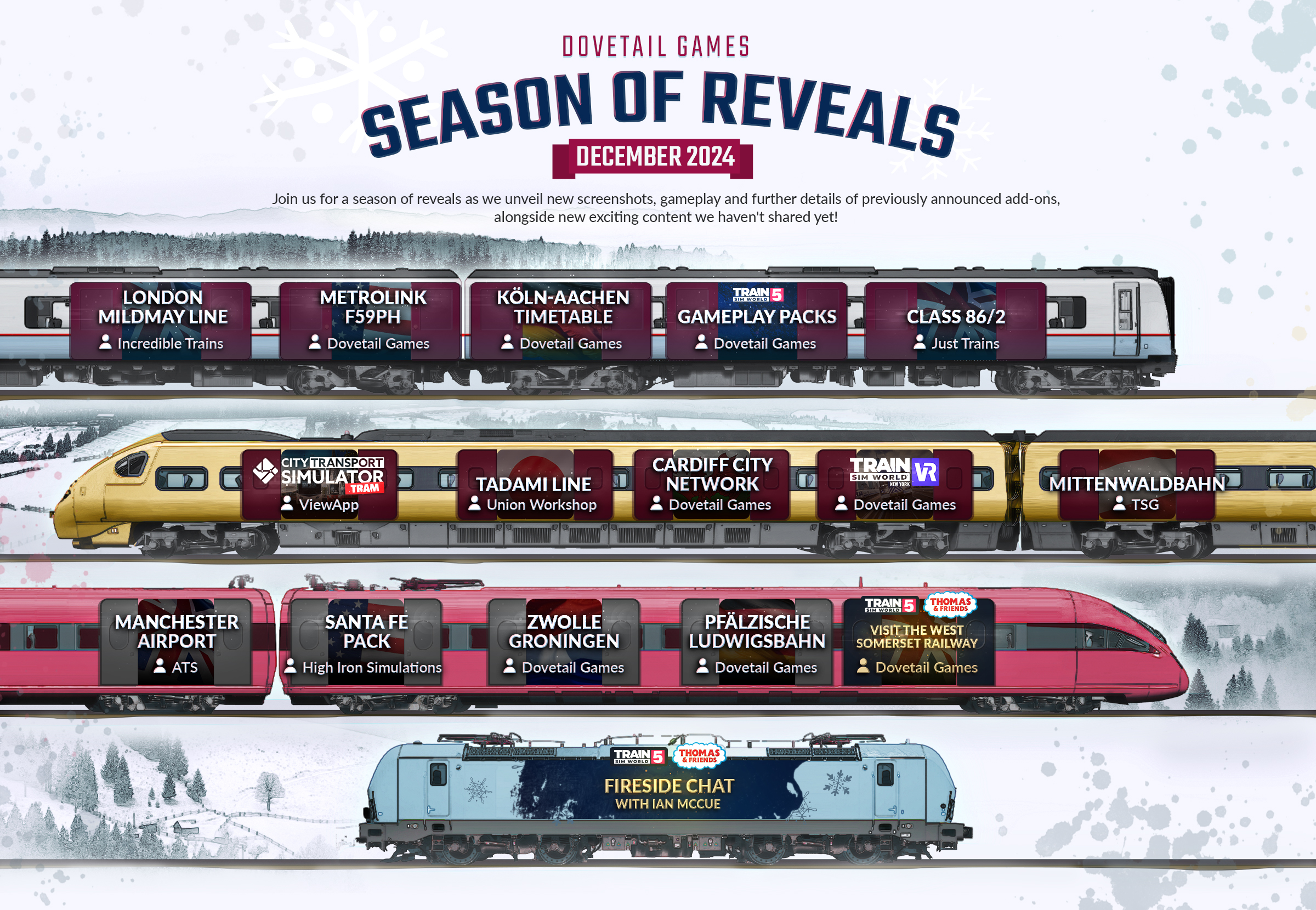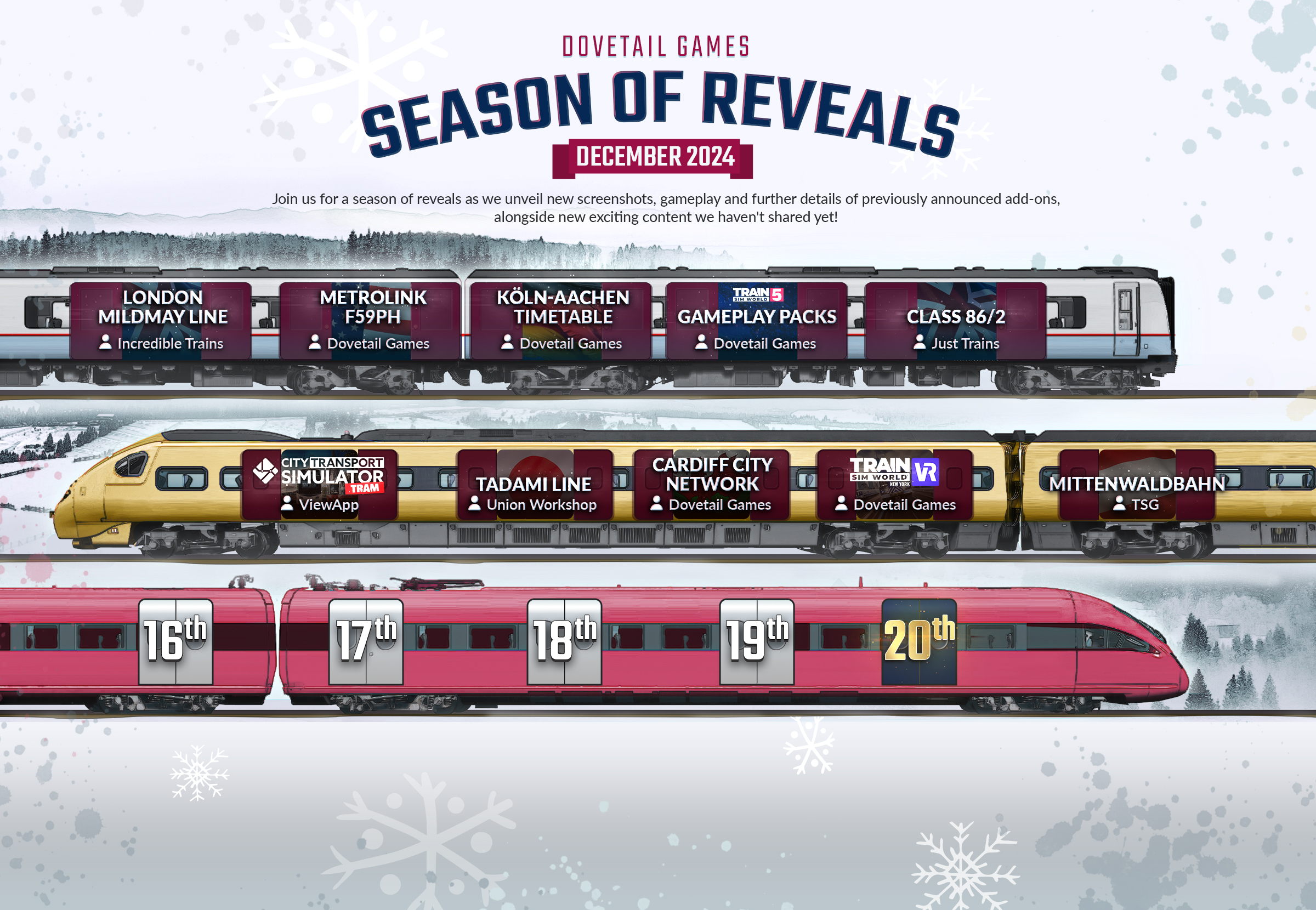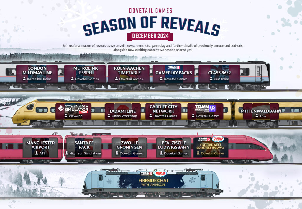 Dovetail Games startete die „Season of Reveals 2024“, ein Monatsevent mit neuen Updates und Ankündigungen zu ihren Titeln. Der Fokus lag auf Train Sim World, TSW VR: New York und City Transport Simulator: Tram. Jeden Werktag wurde eine neue Ankündigung auf den sozialen Kanälen geteilt, mit einem besonderen Reveal am 20. Dezember. Der Artikel wurde regelmäßig aktualisiert, um alle Reveals und exklusive Einblicke zu bündeln. Wir versuchen euch diese hier kurz zusammenzufassen.