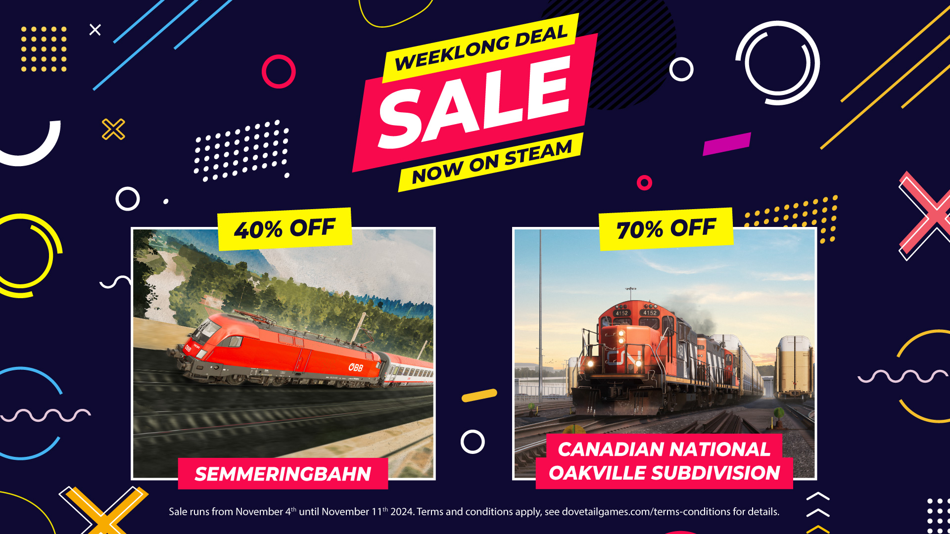 Vom 04.11.2024 bis 11.11.2024 ist die Semmeringbahn: Wiener Neustadt – Mürzzuschlag um 40% sowie die Canadian National Oakville Subdivision um 70% reduziert.