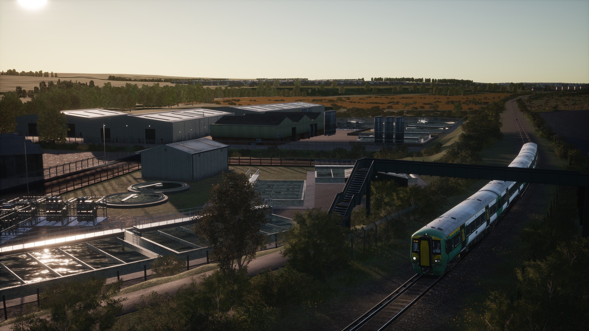 Ein Thema, welches aber schon bei vorherigen Add-Ons immer wieder genannt wird, ist die Ausgestaltung der gleisfernen Szenarie. Bei Rhein-Ruhr Osten gab es durch neue Bäume eine deutliche Verbesserung. Bei East Coastway hingegen scheint dieses neue System nicht genutzt zu sein, da hier besonders Hügel im Hintergrund komplett kahl und gleich texturiert sind. In der Reaität stehen zwar keine Bäume auf diesen Hügeln, aber es gibt unterschiedliche „Farben“ der Böden durch zum Beispiel verschieden angelegte Felder. Trotzdem ist es insgesamt im Vergleich zu einigen vorherig erschienen Strecken viel schöner ausgestaltet.