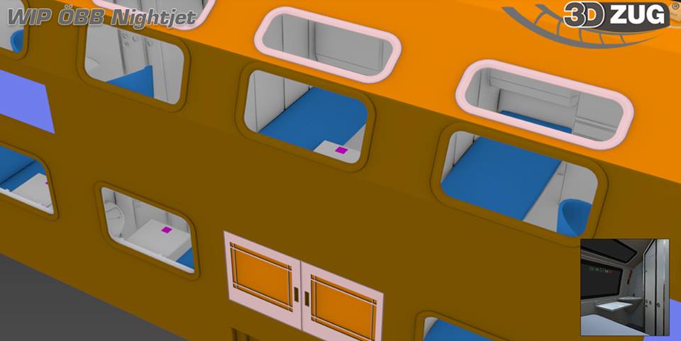 Schnell war klar, es muss sich um einen Nightjet handeln. So ist es auch! 3DZUG entwickelt derzeit den Nightjet für den Train Simulator. Er wird wieder voll begehbar sein (jeder Wagen, jeder Sitz).