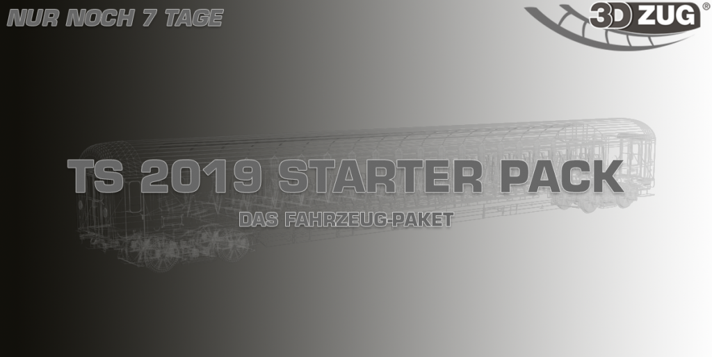 Der TS 2019 steht mit 64 Bit vor der Tür. Damit man direkt loslegen kann, hat sich 3DZUG etwas besonderes überlegt. 3DZUG hat ein einmaliges Fahrzeug-Paket geschnürt, welches ab dem 11. Oktober für insgesamt 30 Tage erhältlich sein wird. Anschließend wird das Starterpack vom Netz genommen. So wie damals die erste Jahresbox. Käufer behalten es natürlich und auch kann der Inhalt danach weiter einzeln (wie jetzt auch) erworben werden.