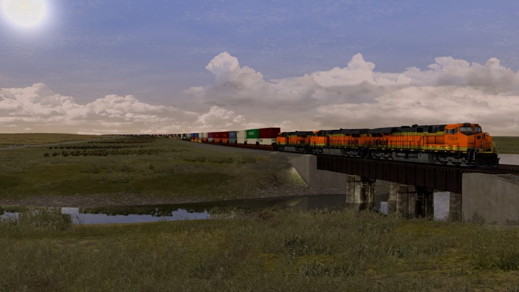 Landschaftsbedingt sind die weiten Ebenen bestimmt nicht jedermanns Geschmack, da es mit der Zeit eintönig wirken kann. Kleinere Fehler im Gleisbau und einzelne schwebende Vegetations-Assets sind noch verschmerzbar. Als störend kann man die genannte Himmelserscheinung nennen. Dennoch faszinieren die Great Plains – im Zusammenspiel mit den Wolken wirkt die Strecke stimmig und stimmungsvoll. Das Rollmaterial ist mit 3 Loks und einer Vielzahl an Güterwagen umfangreich. Die 100 Meilen bieten somit genügend Spielspass für die mitgelieferten Szenarien und bestimmt auch viel Spielraum für die Erstellung von interessanten Szenarien im Güterverkehr.