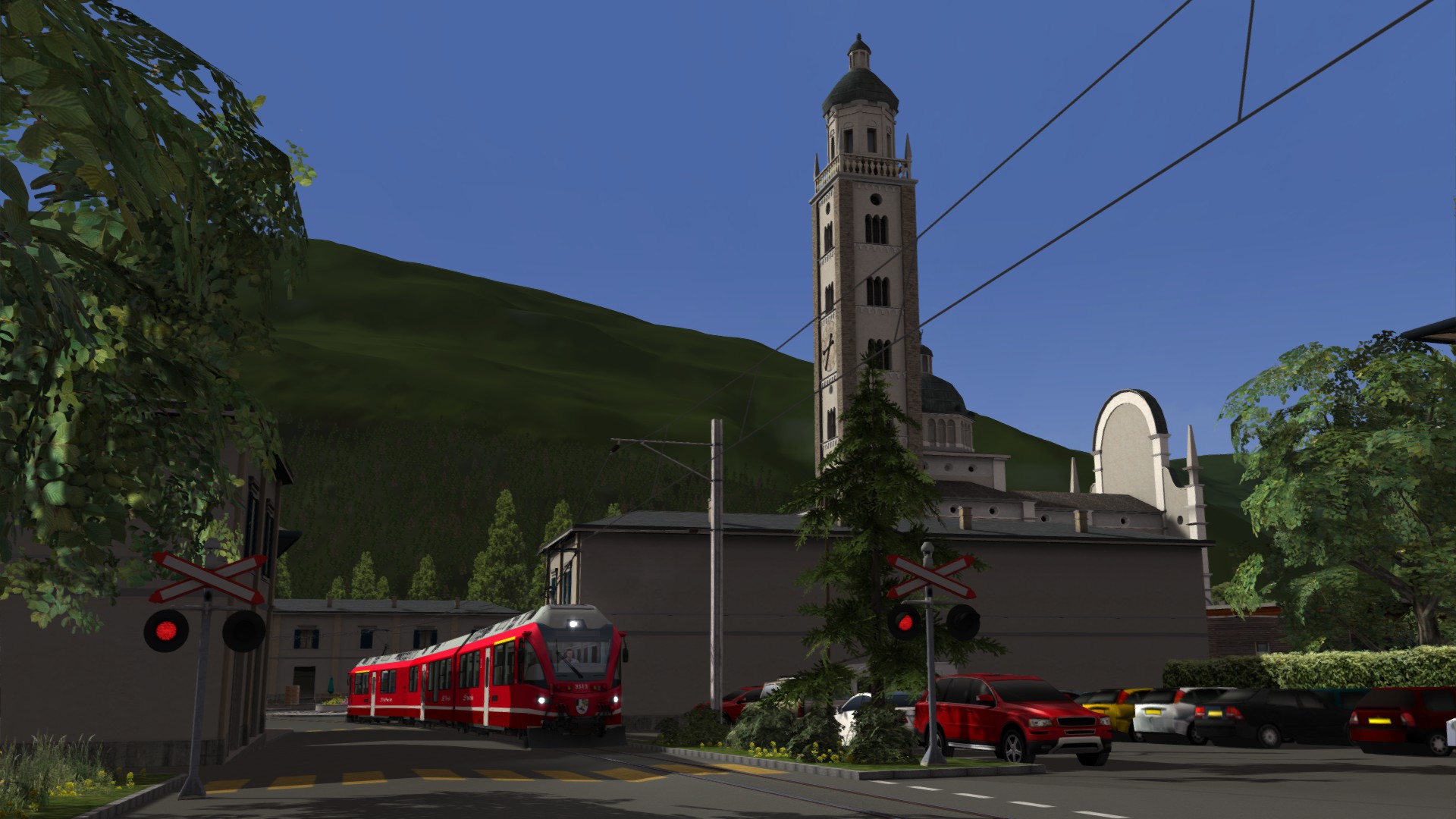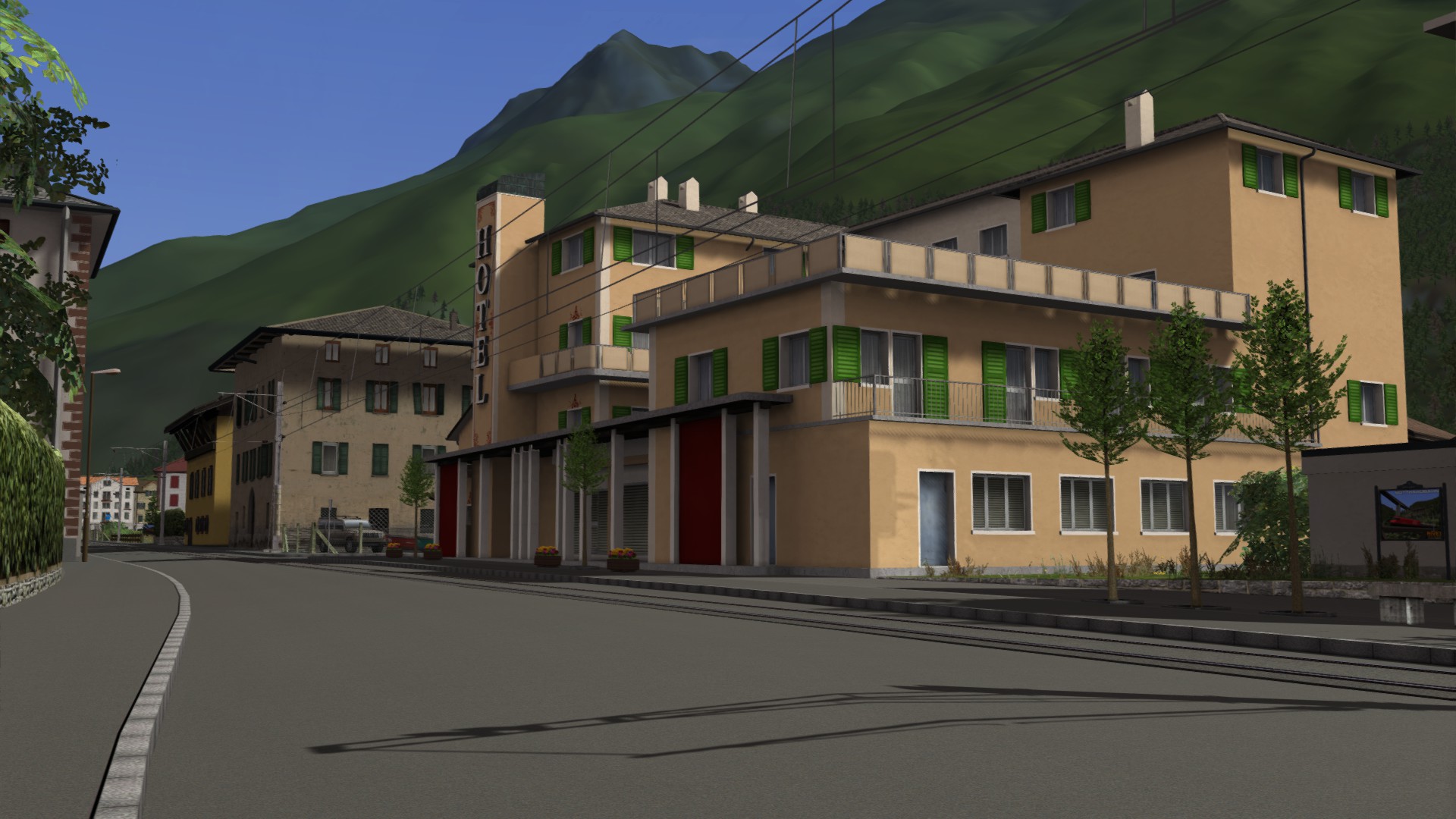 Die Umsetzung der Szenerie im Tal, durch das die Strecke verläuft, ist enorm detailliert. Das beginnt bei der Vegetation und setzt sich fort bei der Ausgestaltung der Ortschaften. Auch die Gebäude – vor allem jene, die man in den Ortsdurchfahrten aus nächster Nähe zu sehen bekommt – sind sehr schön modelliert und texturiert worden. Alles in allem ist der Wiedererkennungswert ziemlich hoch.